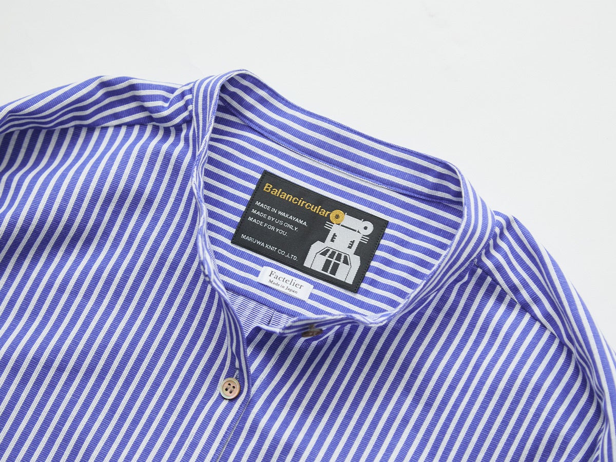 世界で唯一、和歌山県の「丸和ニット」だけが所有する編み機「バランサーキュラー」で編み上げた特殊な生地を使用した、「ストライプバンドカラーブラウス」が登場。
