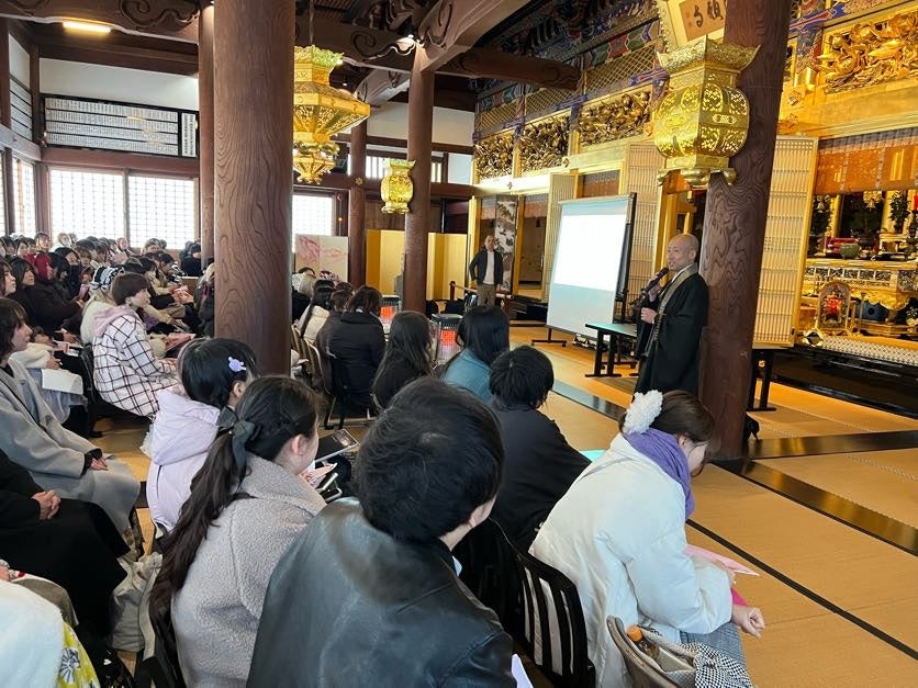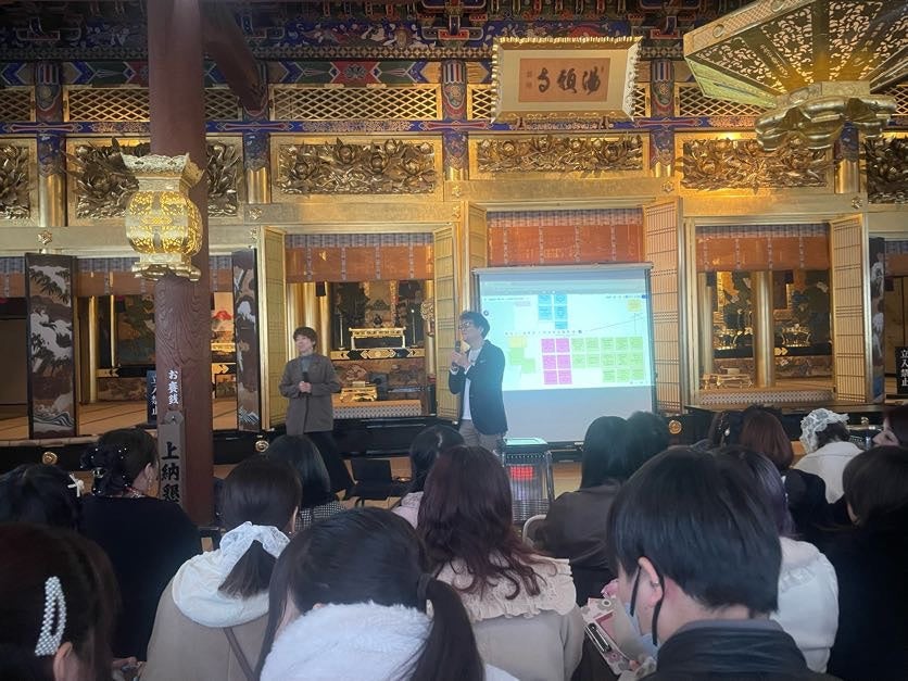 そしてその実施場所にも工夫が。今回会場として選ばれたのが、「陽願寺」。同寺は、地域の人々が集い、繋がりが生まれる場所であってほしいという想いから様々なイベント企画に場所を貸し出しており、これまでもファッションショーを開催するなどアイジーエーの取り組みにご協力いただいています。講演前に住職からその想いが語られ、学びの場そのものにも“地域とのつながり”を感じられる時間となりました。