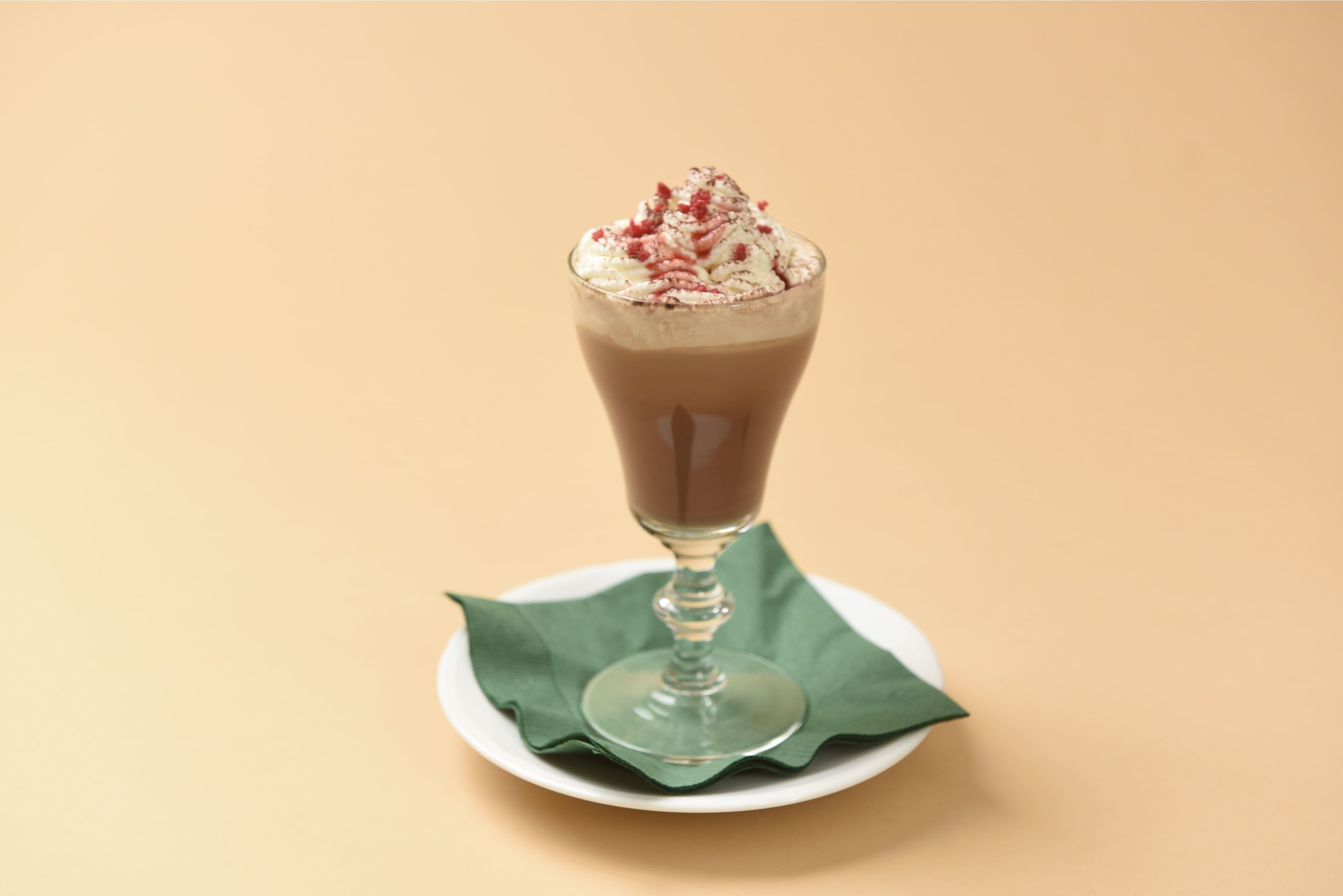 喫茶の定番、カフェモカにストロベリーシロップ、カモミールをブレンドし、カクテル風にアレンジしたホットドリンクです。甘くて暖かい特別なカフェタイムをお楽しみください。