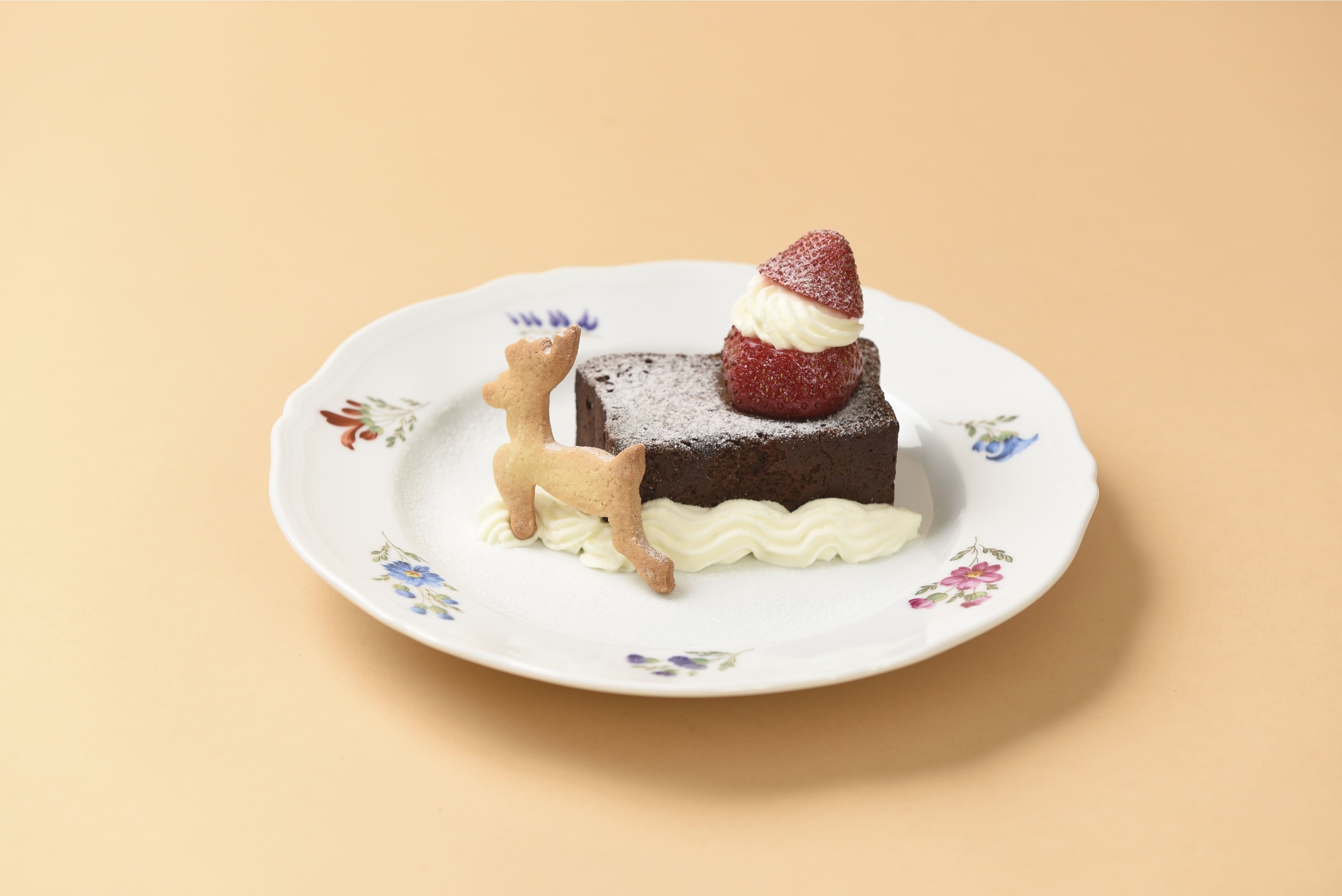 トナカイがサンタのそりを引いている場面をイメージしました。ほろ苦さを感じられるガトーショコラを、甘い生クリームと共にお召し上がりいただき、ぜひいちごのサンタさんを呼んでみてください。