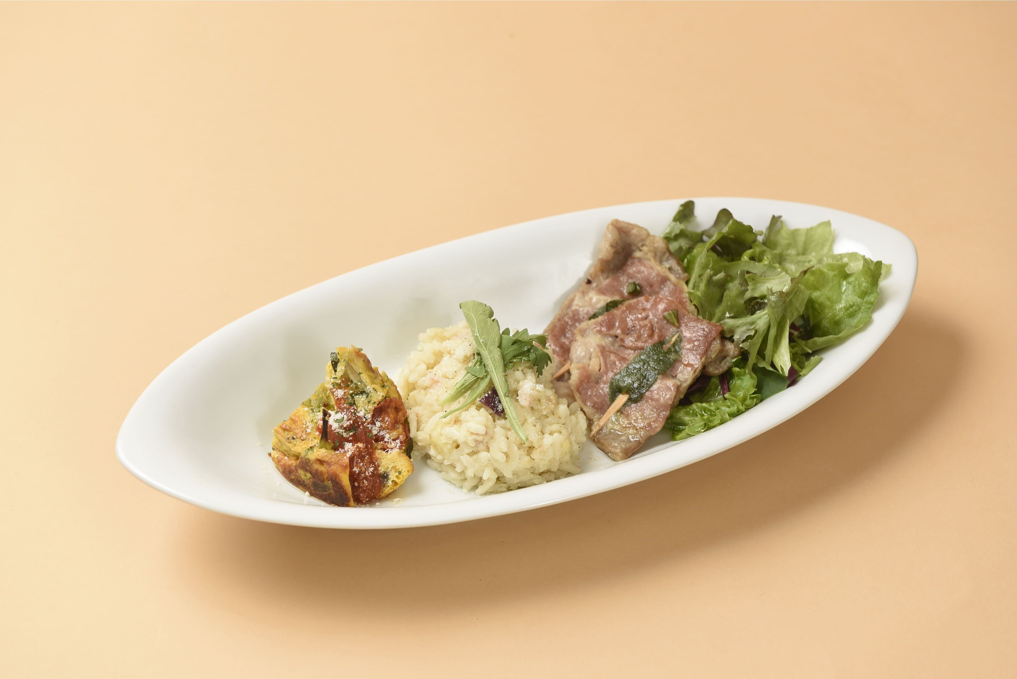 冬野菜がたっぷり入ったフリッタータ、カニとさつまいものリゾット、豚肉と生ハムのサルティンボッカと、ホリデーシーズンらしく豪華な盛り合わせにいたしました。ワンプレートでイタリアの冬を感じてください。