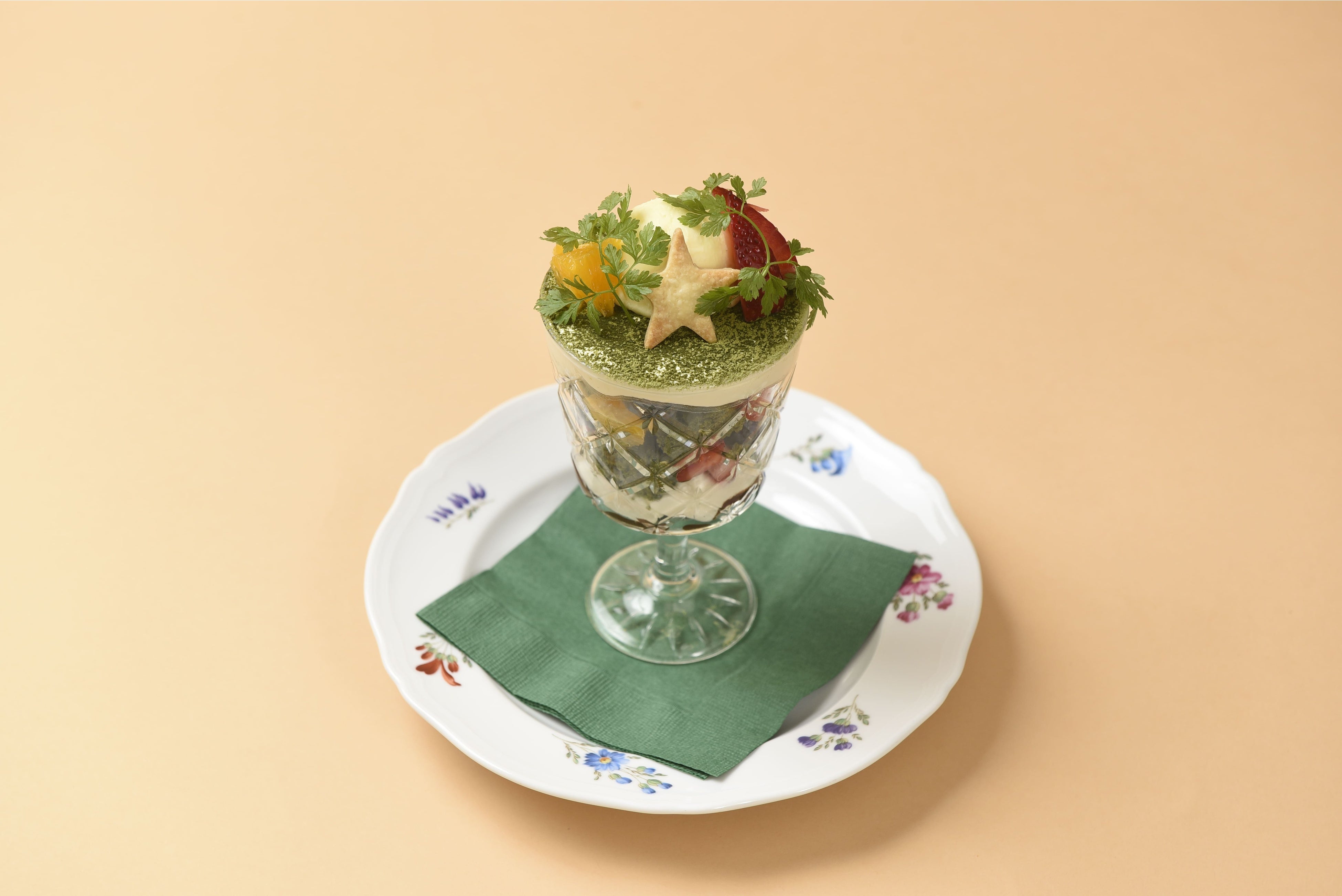 プレーンと抹茶のスポンジと5種類のフルーツ、星形のクッキーを、クリスマスツリーをイメージして組み立てたパフェです。