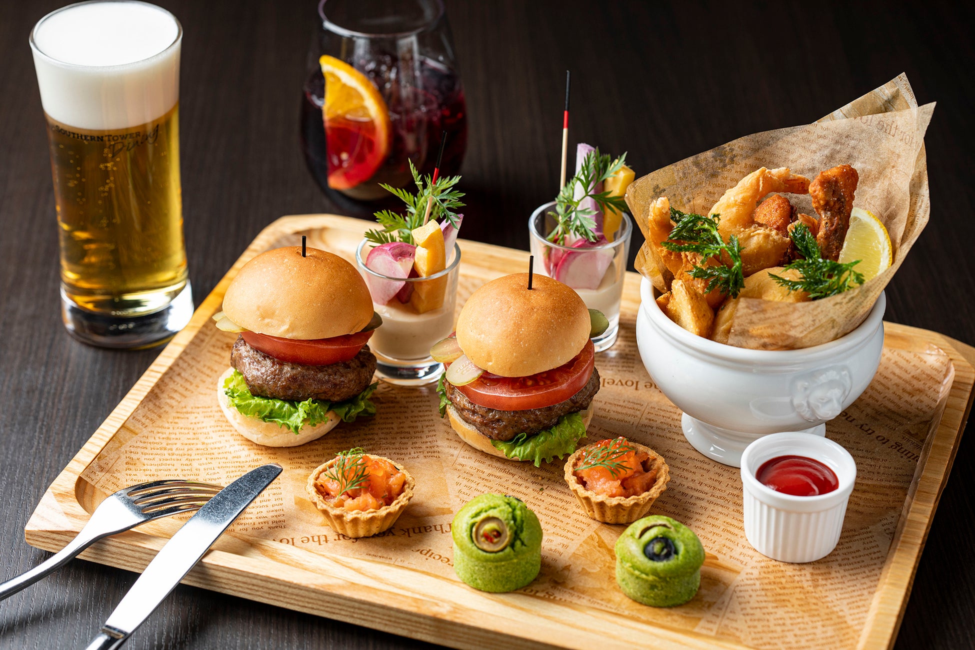 サザンタワーダイニングで人気の熊本県産あか牛のパテを贅沢に使った一口で頬張れるサイズのスライダーバーガーをメインに、一口サイズのフィンガーフード、シーフードフリッターを盛り込みおつまみのワンプレートディッシュでご用意します。