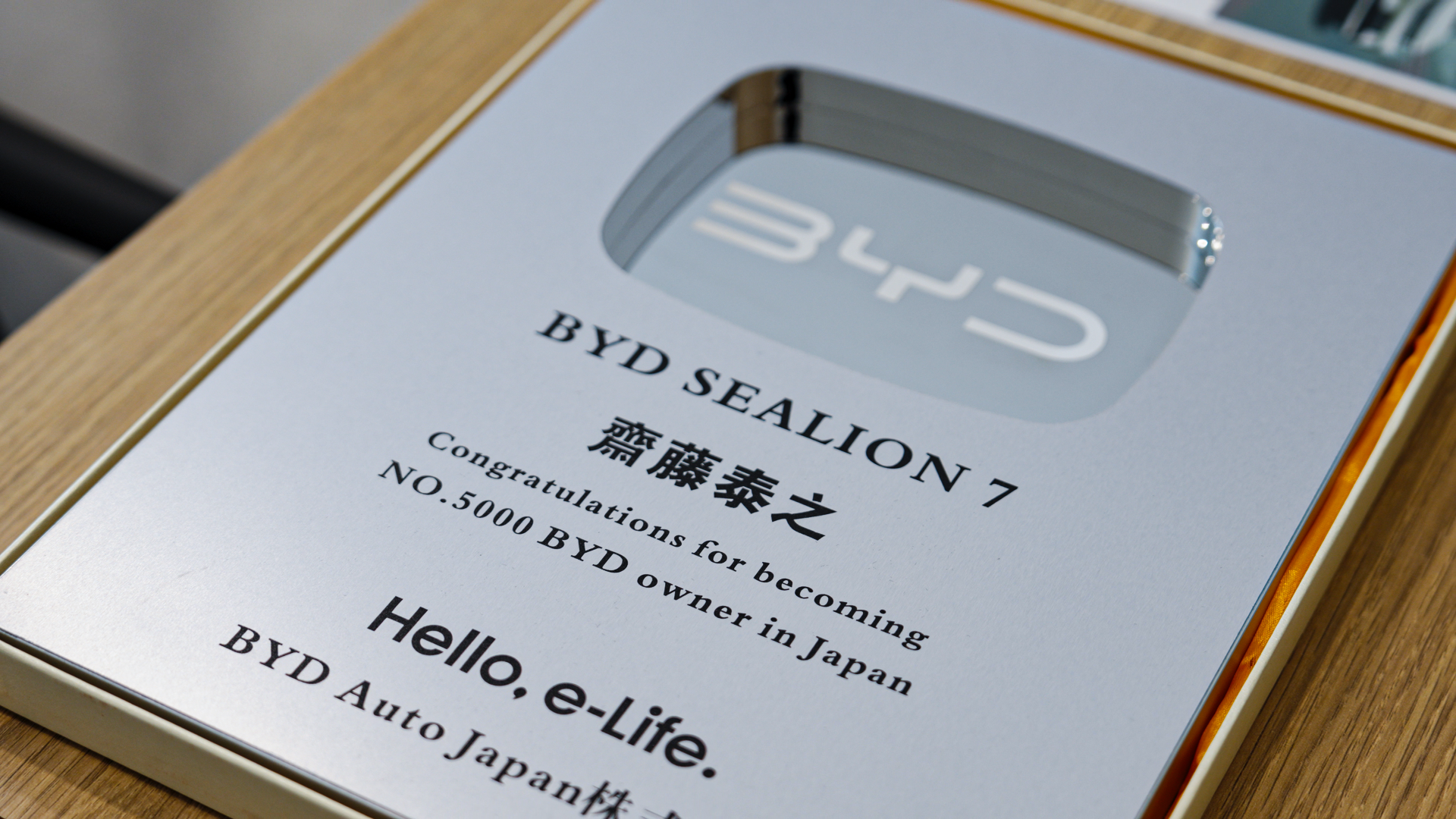 BYDの記念すべき日本導入5,000台目の車両は、今年4月の発売開始以降、とても人気の高いコスモスブラックの「BYD SEALION 7 AWD」でした。この記念すべき車両のオーナーになられた方は、神奈川県横浜市にお住まいで、有料老人ホーム紹介及び終活相談の会社を経営されている齋藤 泰之(さいとう やすゆき:株式会社GOEN*2 代表取締役)様でした。納車日の当日は、BAJの東福寺社長と、販売店を運営する株式会社アクセルの岡本二久 代表取締役社長が出席。お客様には、それぞれの代表者から、BYD SEALION 7 AWD購入への謝辞をお伝えするとともに、BAJが輸入販売した5,000台目の正規車両であることを証明した記念の盾が贈られました。