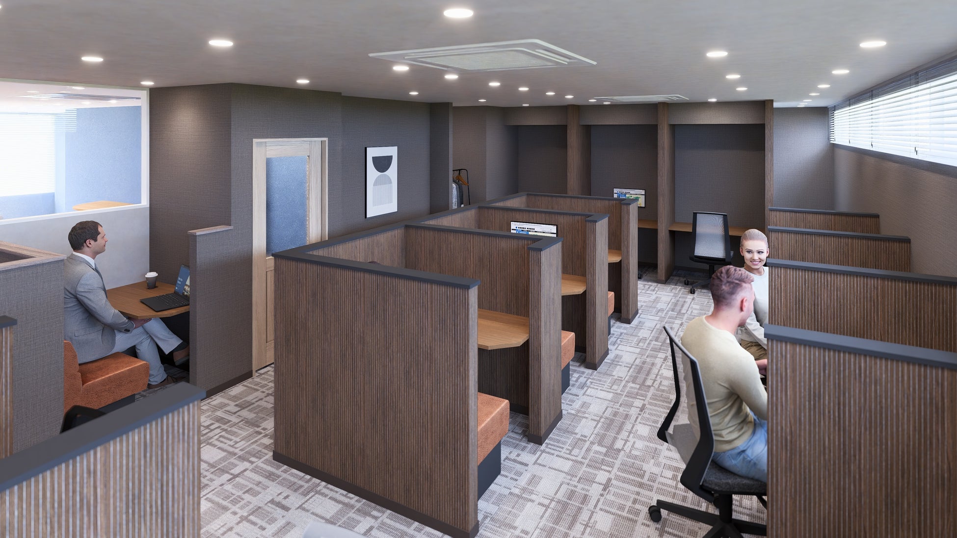 今回出店する「BIZcomfort湘南台」は、アンドウビルの4階・5階部分をそのまま活用し、個室32室とフリースペース42席を備えたシェアオフィスとして空室再生しました。内装は、湘南台の都会的な空間の中に緑を取り入れたデザインとなっています。多様な年代・業種・職種の方々の利用を想定し、テレワーカーや自宅作業に課題を感じている方、資格取得やリスキリングを目指す自習者など、多くのユーザーにとって快適なワークスポットとなるよう、ゾーニングしています。