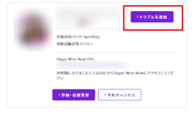 トレーナーが現れない、音が聞こえないなどのトラブルが発生した場合、予約確認画面に表示されている「トラブルを通知」ボタンを押していただくことで、日本人のサポートスタッフがトレーニングのVideo Callルームに入室し、迅速にサポートいたします。また、Video call内でもトラブル通知ボタンを押していただくと同様にサポートスタッフが対応いたします。