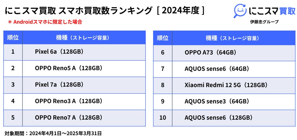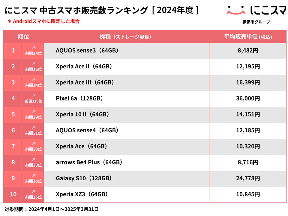 また、2024年11月、にこスマにて日本初となる Google 認定再生品 の販売を開始した影響もあり、Google Pixel 6a が、2023年度の115位から大きく順位を上げて4位にランクインしています。