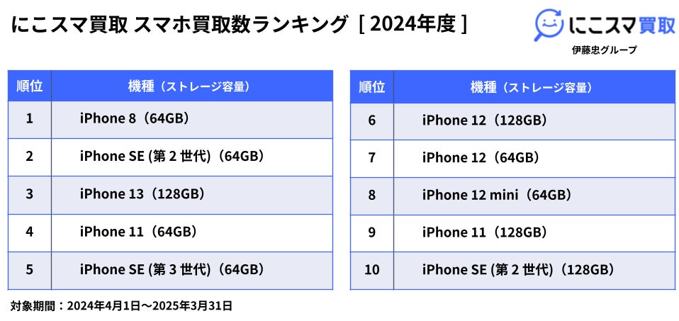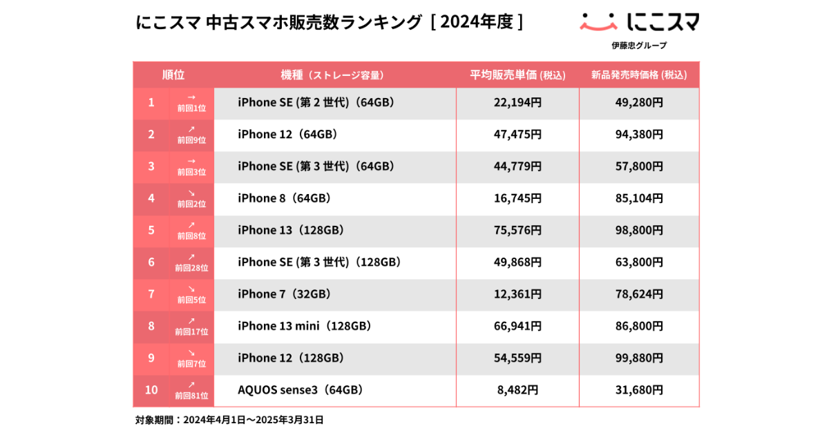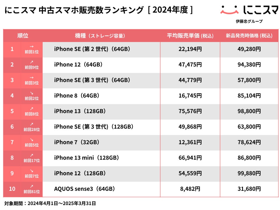 中古スマートフォンの個人向け販売・買取サービス「にこスマ」を運営する株式会社Belong(所在地:東京都港区、代表取締役社長 西村 耕一郎 以下、当社)は、にこスマにおける2024年度の中古スマホ/機種別販売数・買取数ランキングを発表いたします。