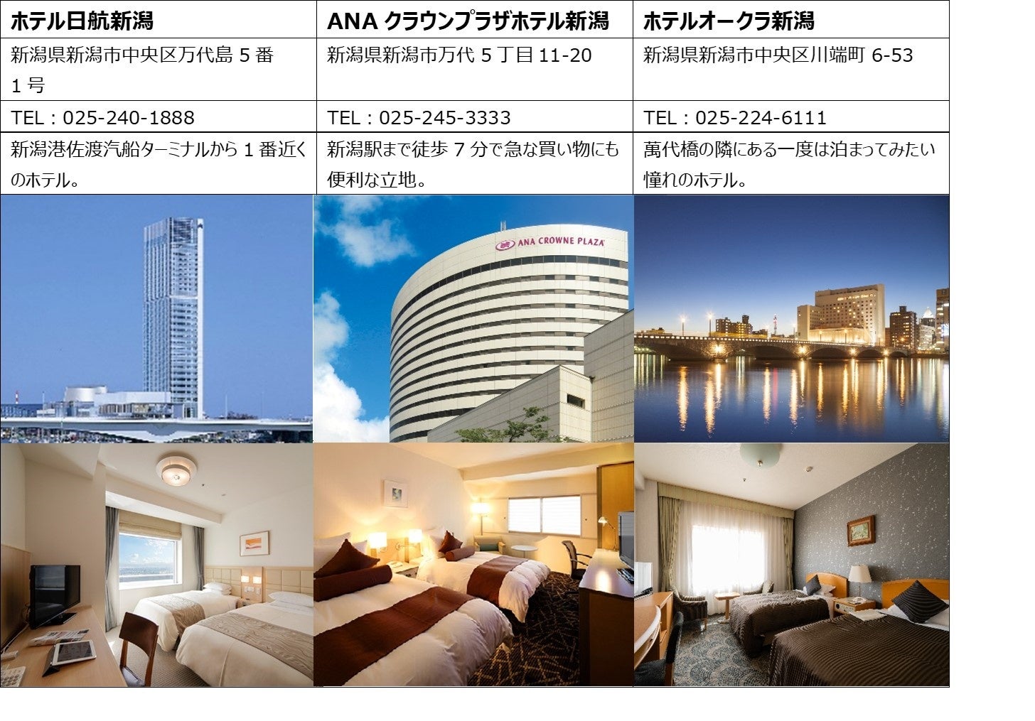 ●旅行代金:両津港からのカーフェリー島民割引きっぷ2等往復+新潟市内のシティホテル1泊素泊り宿泊代がセット。お一人様あたり(1~3名様1室)大人 11,500円、小児 9,500円(税込)
