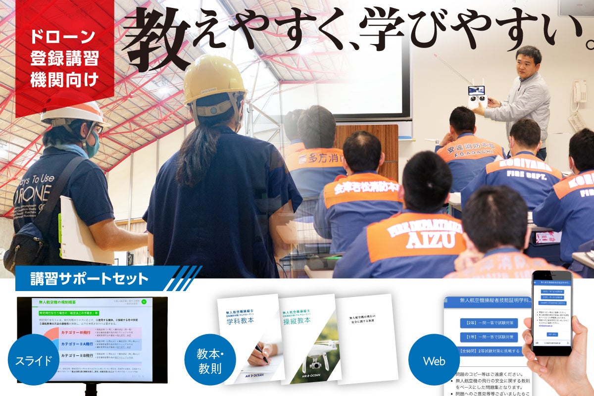 「福島ドローンスクール」、「エアオーシャン ドローンスクール東京校」を運営する株式会社スペースワン(東京・上野)は、ドローンの免許制度「無人航空機操縦者技能証明」の登録講習機関の運営を後押しする『講習サポートセット』の提供を開始します。