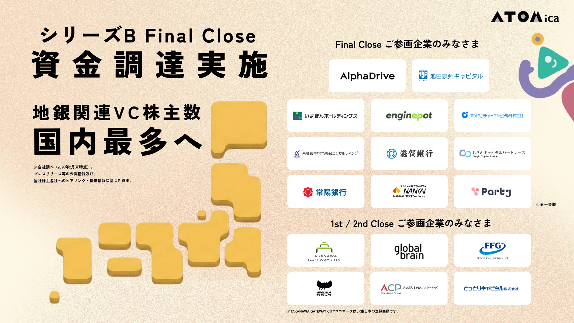 ATOMica、シリーズBラウンド資金調達を完了。地銀関連VCの株主数日本一へ。