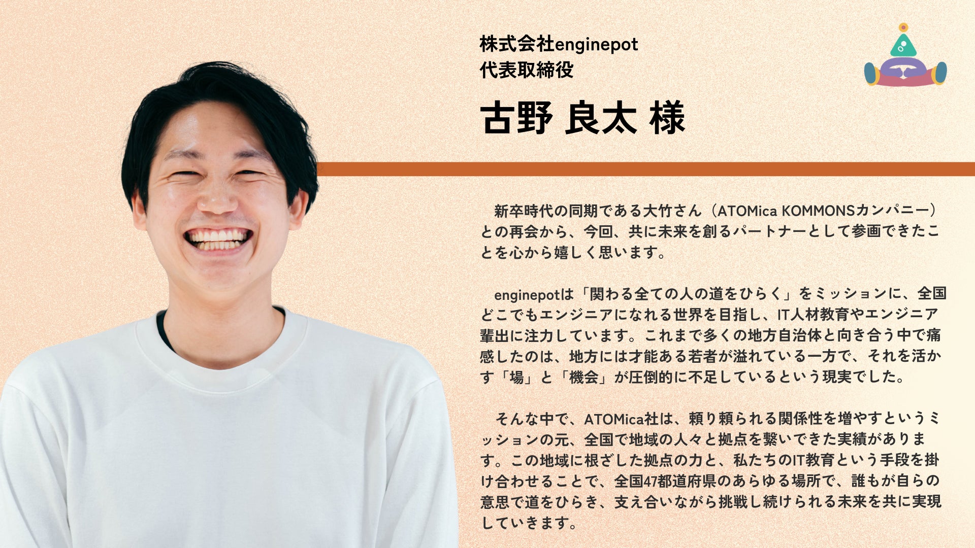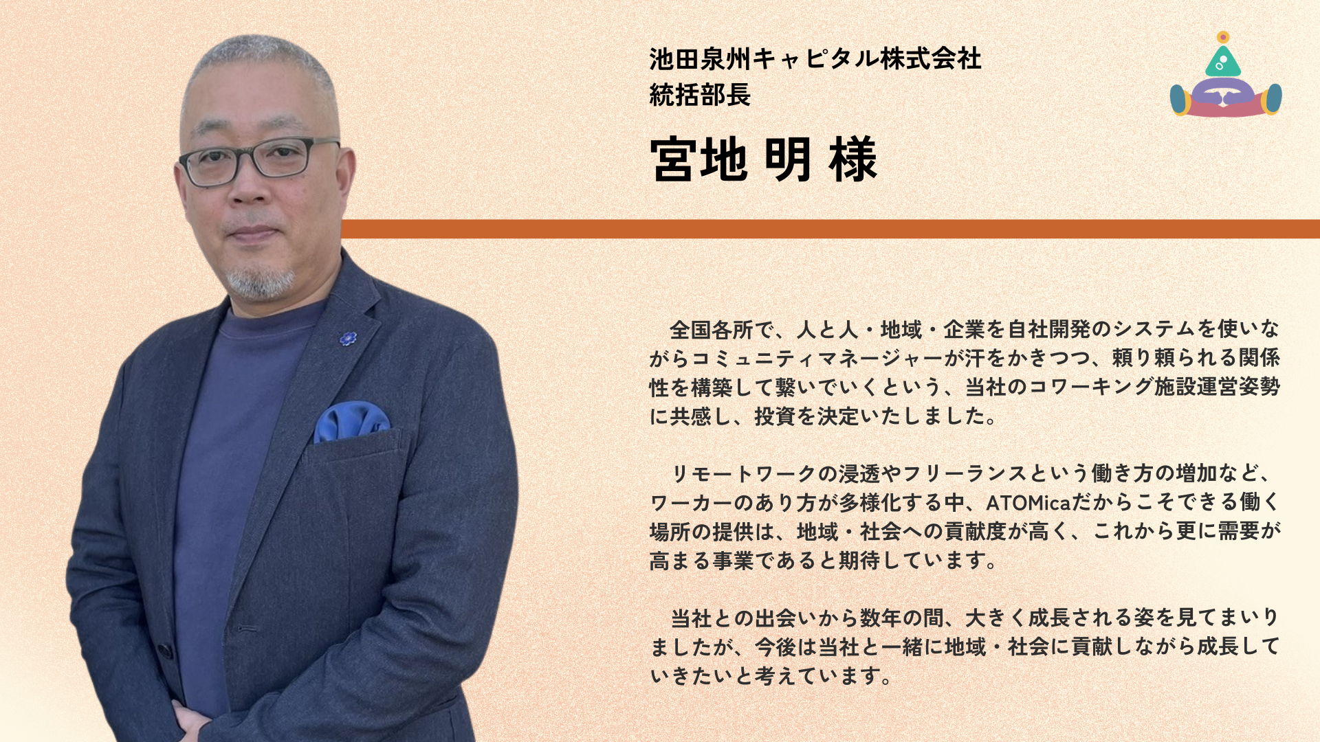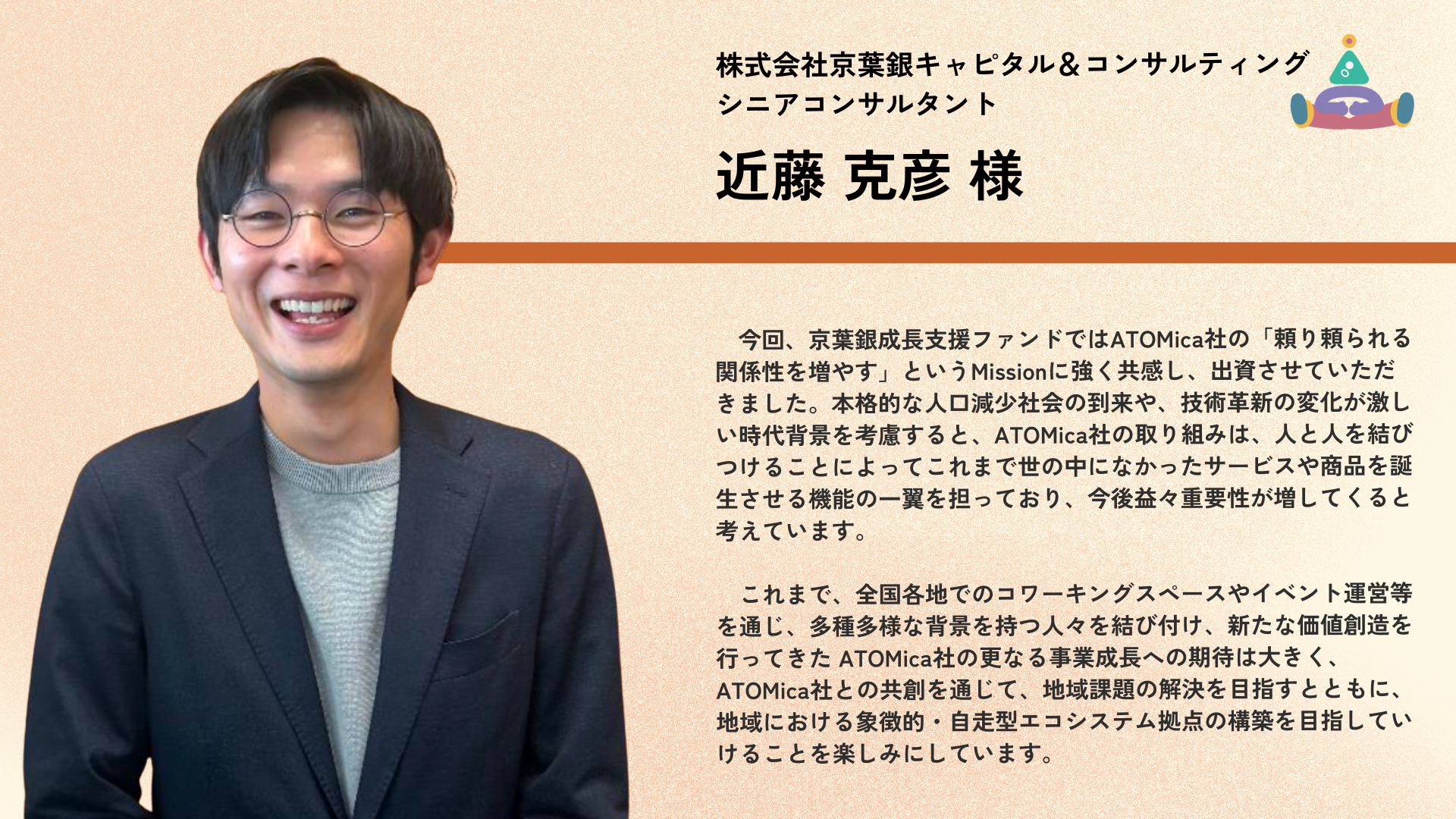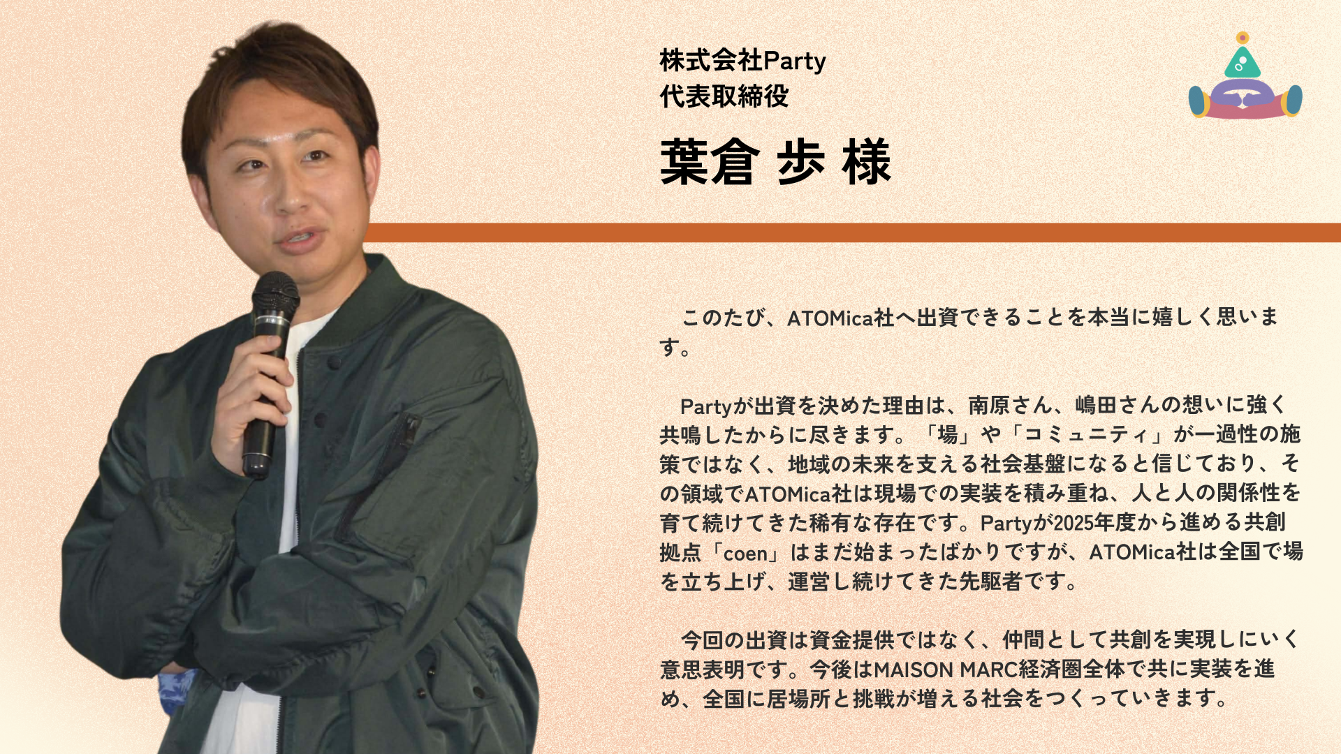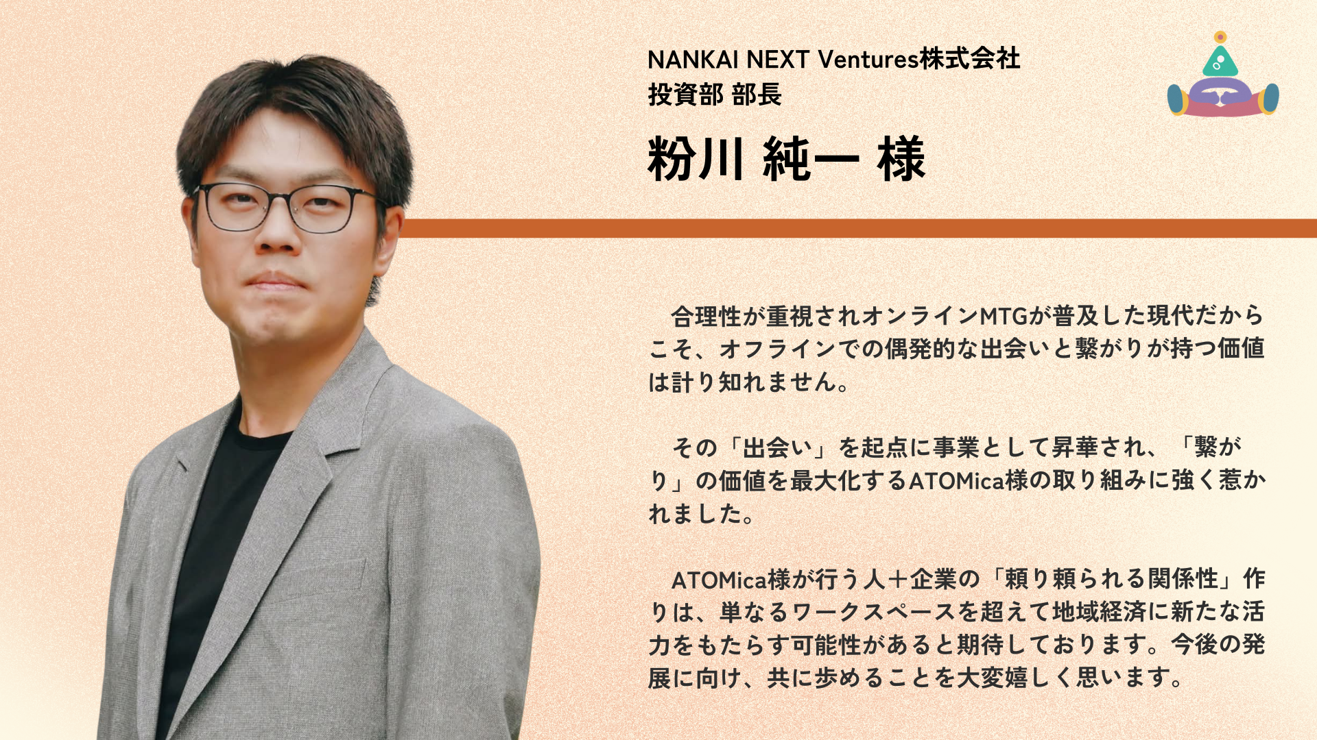 株式会社ATOMica(読み:アトミカ)は、ソーシャルコワーキング®事業を全国で展開する、創業6年のスタートアップ企業。あらゆる願いに寄り添い、人と人を結び続けるために、企業や自治体、大学や地域をはじめとする多種多様なステークホルダーが保有する場に対して、コワーキング施設をゼロからプロデュース・運営。場所としてのコワーキングスペースの枠を超え、出会いや交流、共創を持続的に生み出すためのコミュニティづくり、街づくりを行なう。現在、全国で60以上の施設(※)を運営している。「東洋経済すごいベンチャー100」2025年版に選出。