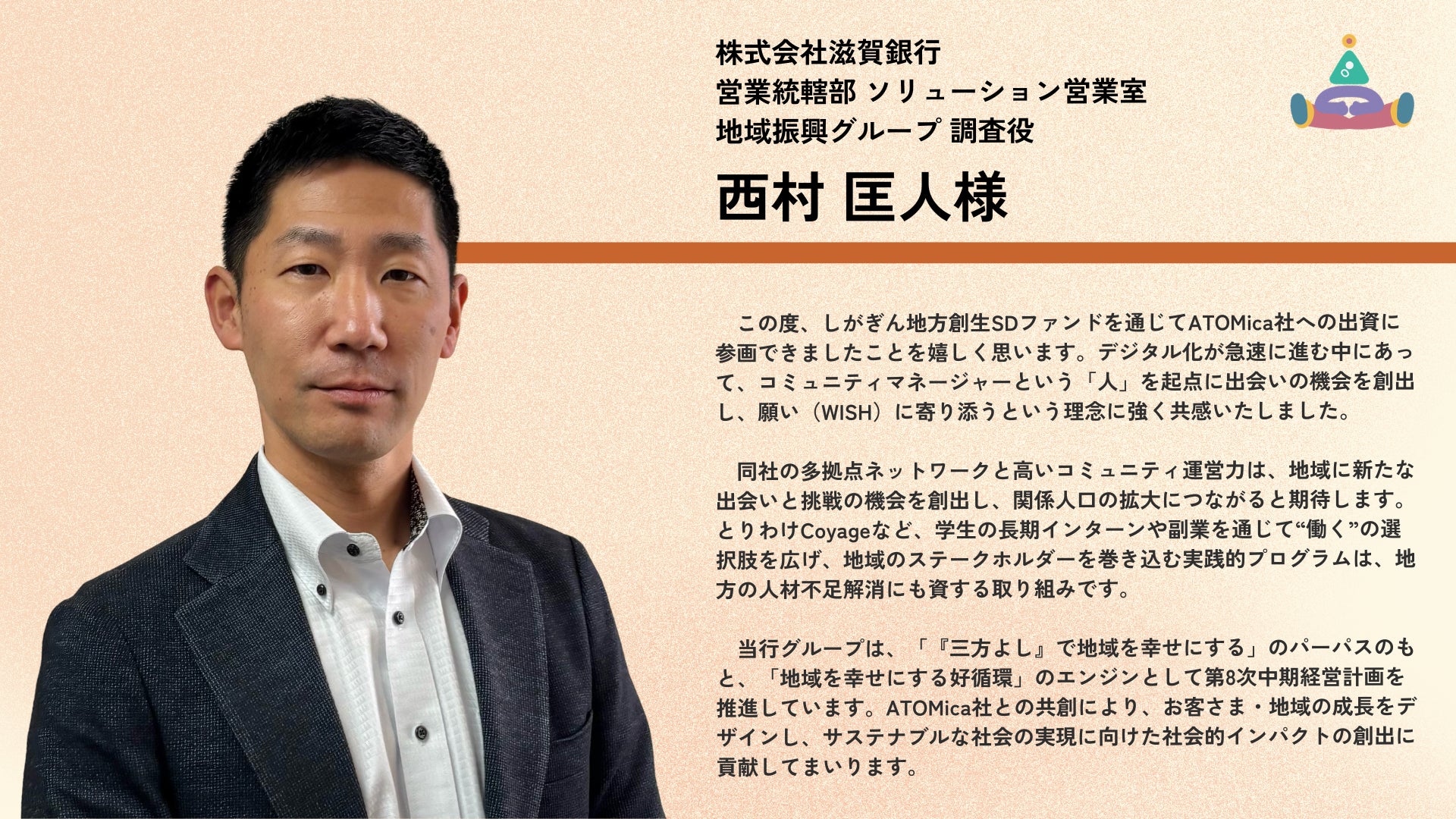 株式会社ATOMica(本社:宮崎県宮崎市、代表取締役Co-CEO:嶋田瑞生・南原一輝、以下「ATOMica」)は、シリーズBラウンドのファイナルクローズを完了したことをお知らせいたします。2025年6月の1stクローズ、同年7月の2ndクローズに続き、今回新たに11社の新規株主のみなさまを迎え、本ラウンド総額は5.7億円、増資を通じた累計資金調達額は19億円となりました。