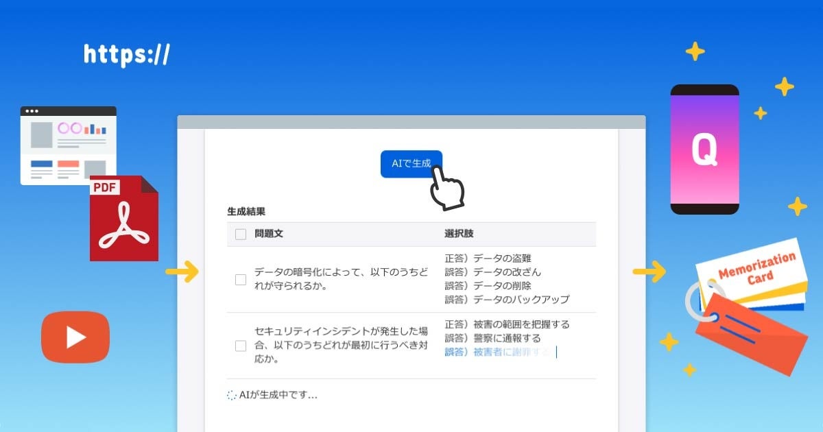 learningBOXにアップロードした動画やPDF教材、WebサイトのURL等から、ワンクリックでクイズ・テスト問題を自動生成できます。