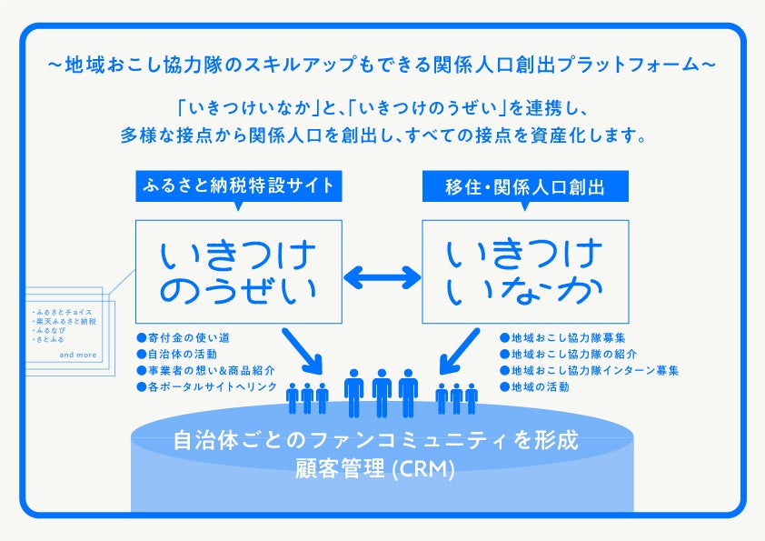 具体的には、本プラットフォームを構成する地域求人募集・情報発信サイト「いきつけいなか」、地域の想いを伝えるための納税特設サイト「いきつけのうぜい」、および両サイトの会員管理を効率的に行う国産のクラウド型CRM(総合顧客管理)システム「Synergy!」をセットにしてご提供いたします。さらに、地域おこし協力隊が卒業後の仕事として活躍できるように、本プラットフォームの運用を含めた人材育成やスキルアップ講座(自走支援、伴走型支援)「協力隊スキルアップ」もご提供いたしますので、地域を応援してくれる人(関係人口)を資産化する総合戦略としてご活用いただけます。