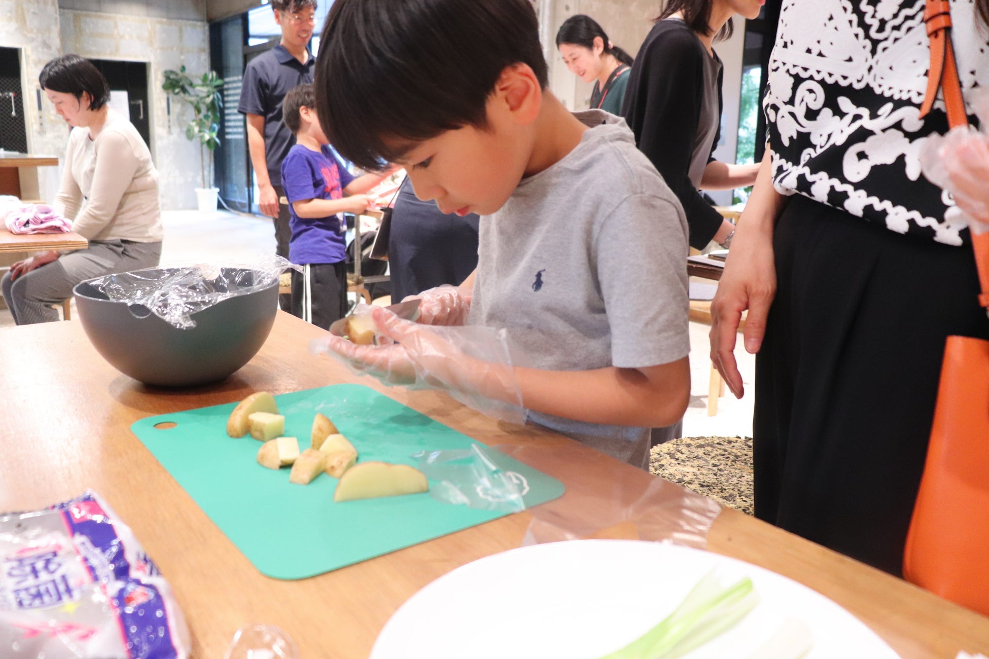 料理体験では、イベント後にご家庭でも楽しんでいただけるよう「食品ロスに繋がりやすい食材」を用いた簡単レシピを竹村氏に考案いただき、そのレシピを元にじゃがいもの皮ごと使用した「じゃがいものみそ炒め」を作る体験をしていただきました。お子さまたちは興味津々で取り組んでいました。