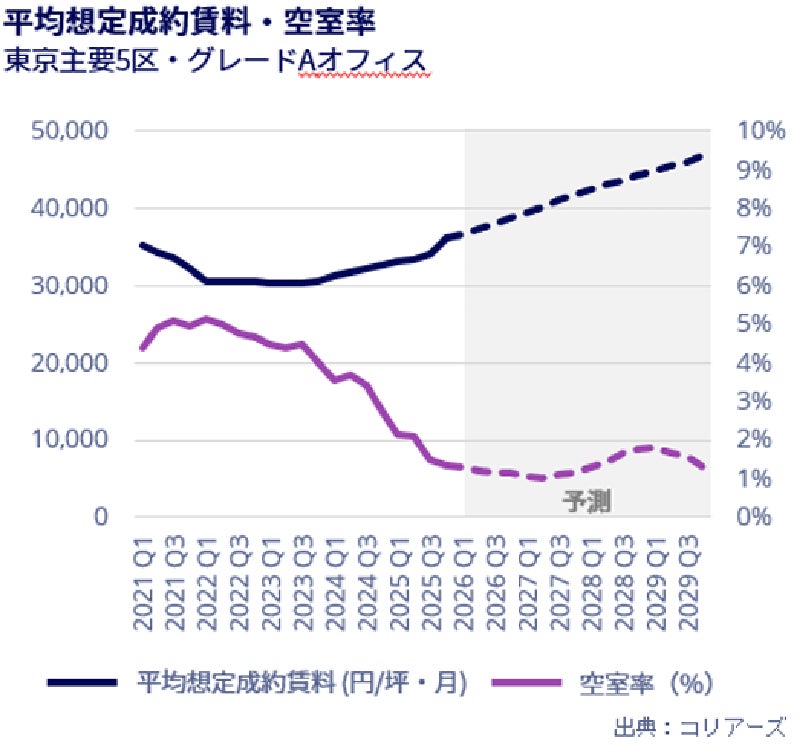 大手総合不動産コンサルティングサービスであるコリアーズ・インターナショナル・ジャパン株式会社(代表:谷川雅洋、本社:東京都千代田区、NASDAQおよびTSX:CIGI、以下コリアーズ・ジャパン)は、「オフィスマーケットレポート | 東京主要5区・グレードAオフィス | 2025年第4四半期」を発刊いたしました。本レポートでは、2025年10〜12月期の東京主要5区におけるグレードAオフィス賃貸市場の動向を分析しています。