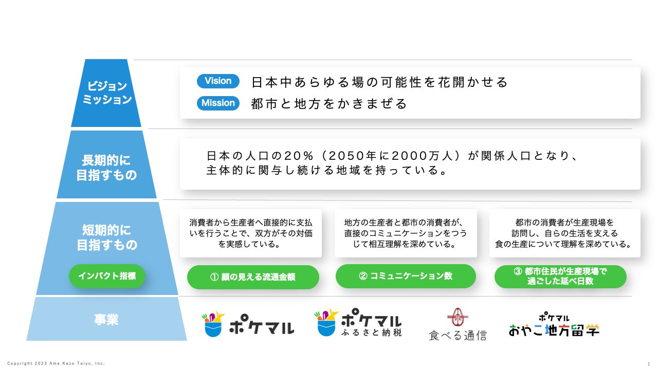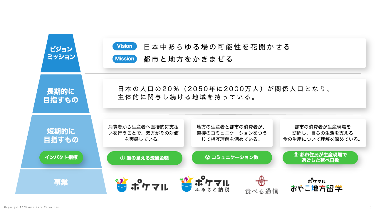 この度、”関係人口の創出”がいかにして日本にポジティブな影響を与えるのかを可視化し、「都市と地方をかきまぜる」というミッションと「日本中あらゆる場の可能性を花開かせる」というビジョンの実現に寄与していくかを明らかにするために、「関係人口とインパクト」ページと、当社初となるインパクトレポートを公開いたしました。当社では魅力ある地方を、そして多様な日本社会を残すために、2050年までに“2,000万人の関係人口の創出“を目指していきます。