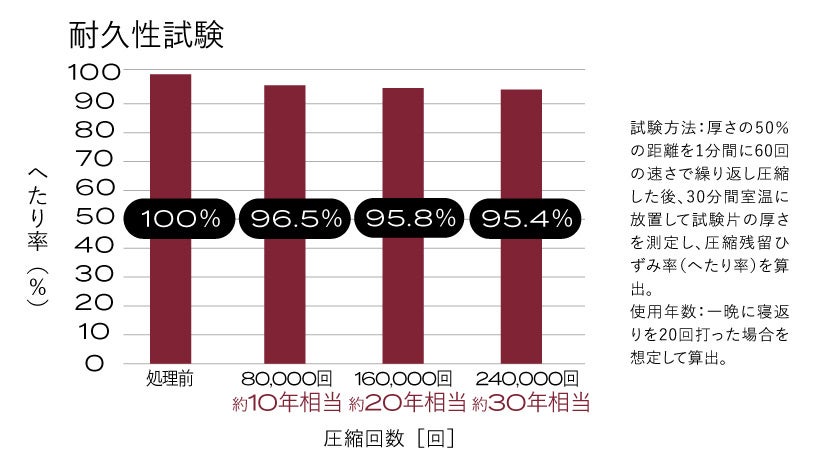 毎日使うマットレスで気になるのはその耐久性。本製品はJIS規格である80,000回に加えて、その3倍である240,000回でも圧縮試験を実施し、復元率95%以上という高い耐久性を実証。長期間の使用でも安定した寝心地が続きます。
