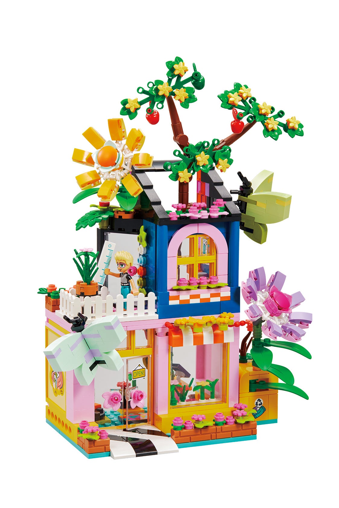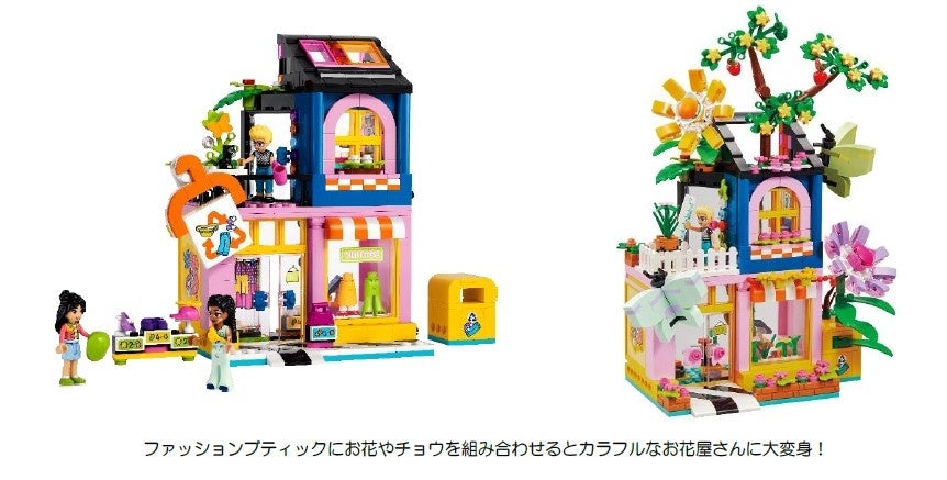 他にも、レゴ®製品ではブロックやパーツを組み替えるだけで、無限のアレンジや遊び方を楽しむことができます。ファッションをテーマにしたごっこ遊びができる「レゴ®フレンズ ビンテージファッションブティック」に「レゴ®クリエイター 3in1 花とじょうろ」のカラフルなお花やチョウを組み合わせることでファッションブティックだけでなくお花屋さんとしても遊ぶことができます。