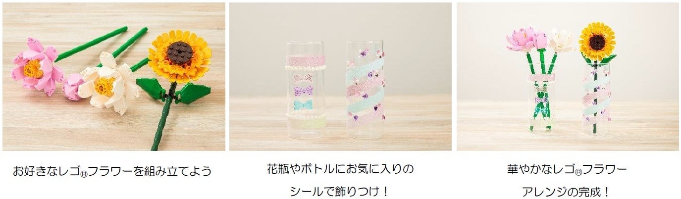 花瓶や手作りのボトルにレゴ®フラワーを飾るだけでシンプルだけど気分も華やぐインテリアの完成!お手入れ無用で咲き続け、デスクやお部屋のちょっとした空きスペースを癒しの空間にしてくれます。