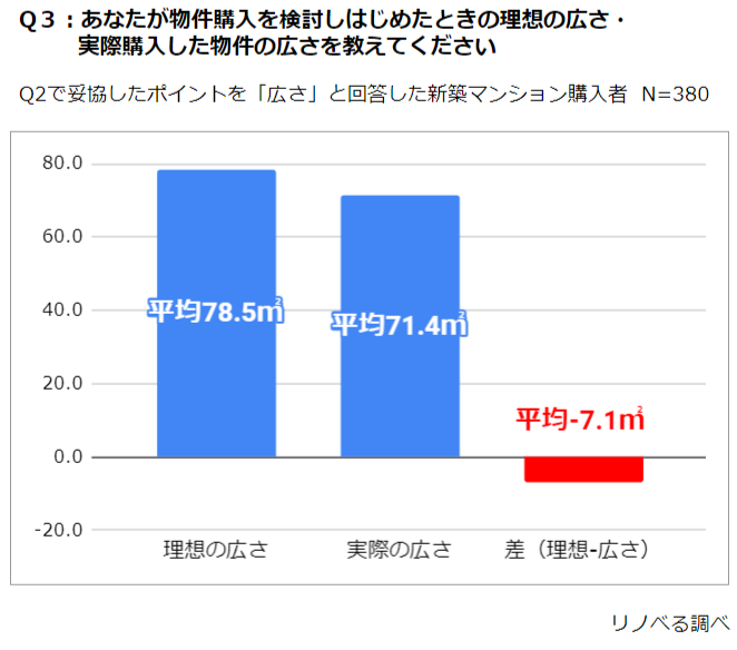 ■新築マンション購入者の理想と現実の「広さ」の差は、約4畳半(7.14㎡)。約1部屋分を諦める結果に。