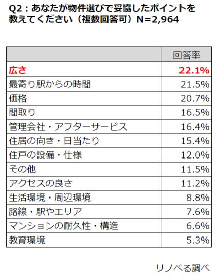 (20.7%)となり、「広さ」を妥協することで、条件に合う住まいを手に入れた様子がわかった。