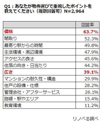 ・「価格」と回答した人が最も多く63.7%、「間取り」が52.3%、「最寄り駅からの時間」が49.8%と続いた。「広さ」と回答した人は39.1%で、重視度数は高くない傾向。