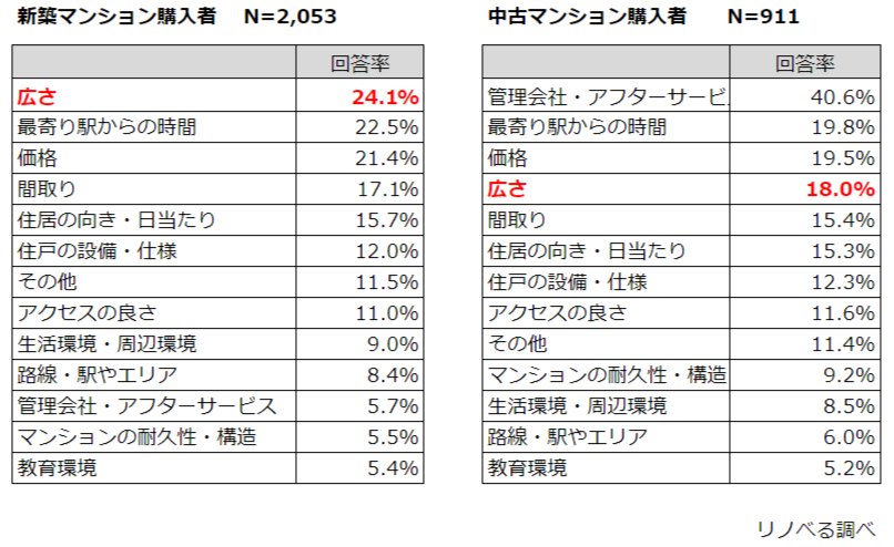 ・マンション購入者全体では、1位「広さ」(22.1%)、2位「最寄駅からの時間」(21.5%)、3位「価格」