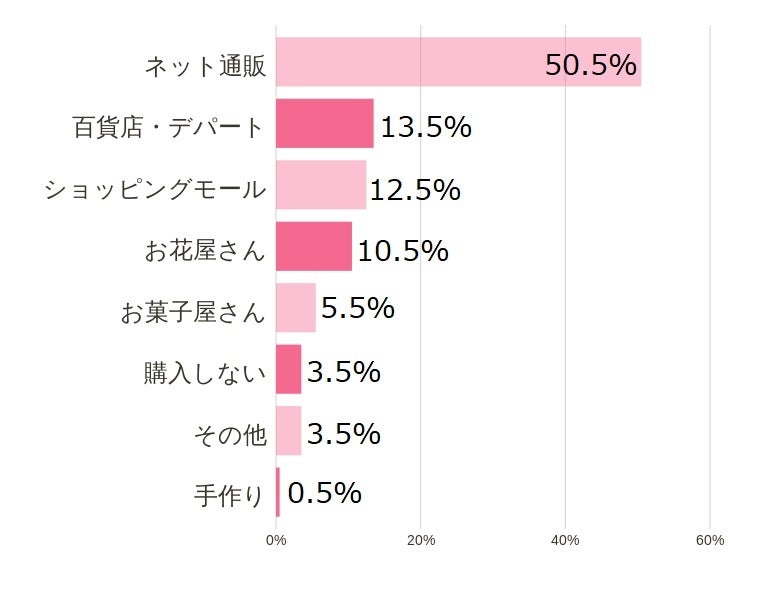 母の日コーナーなど特設コーナーが設置される百貨店・デパートなどは1位より大幅に低い13.5%となりました。コロナ禍でなるべく出歩かないようにという傾向が強くなったことも影響していると考えられます。