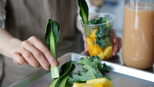 フレッシュジュースやグリーンスムージーは、素材の鮮度もおいしさの一つ。それぞれの店舗で、毎日、野菜やフルーツをカットし、ご注文ごとに一杯ずつミキサーにかけてつくります。