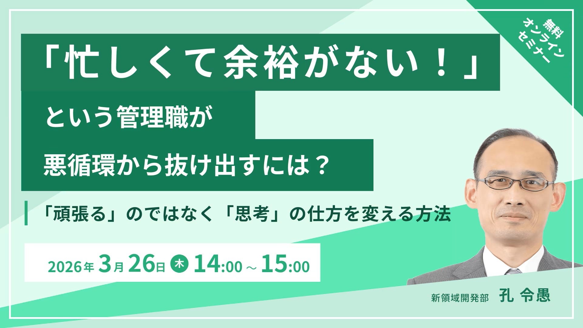 本セミナーでは、忙殺される管理職と「やりくり」が上手い管理職の違いはスキルではなく思考にあるという視点から、短期成果と長期成長を両立するための思考法を紹介し、管理職育成の新たな視点を提供します。