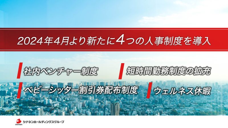 働き方改革の施策としては、2023年4月に副業制度、70歳までの再雇用制度、育児休業中の学習支援、自己都合退職者再雇用制度(アルムナイ制度)、治療と仕事の両立支援を導入いたしましましたが、2024年4月、シナネンホールディングスグループ従業員を対象に、新たに4つの人事制度を導入することになりました。