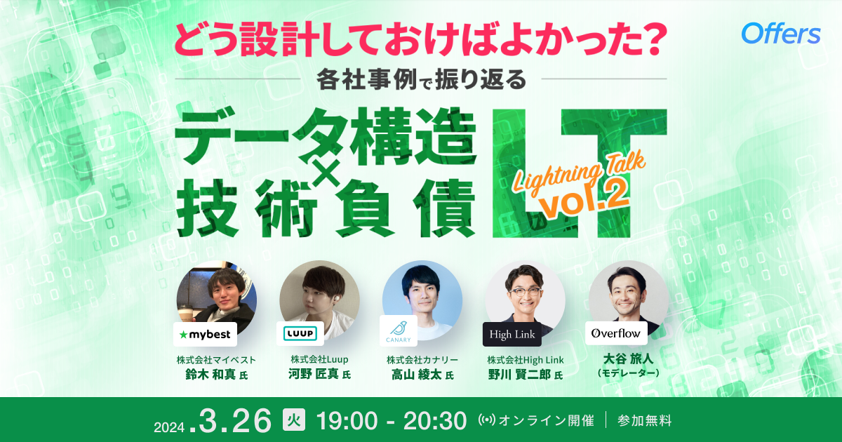 3/26(火)19:00~「[第2弾]どう設計しておけばよかった?各社事例で振り返る データ構造x技術負債LT」を開催