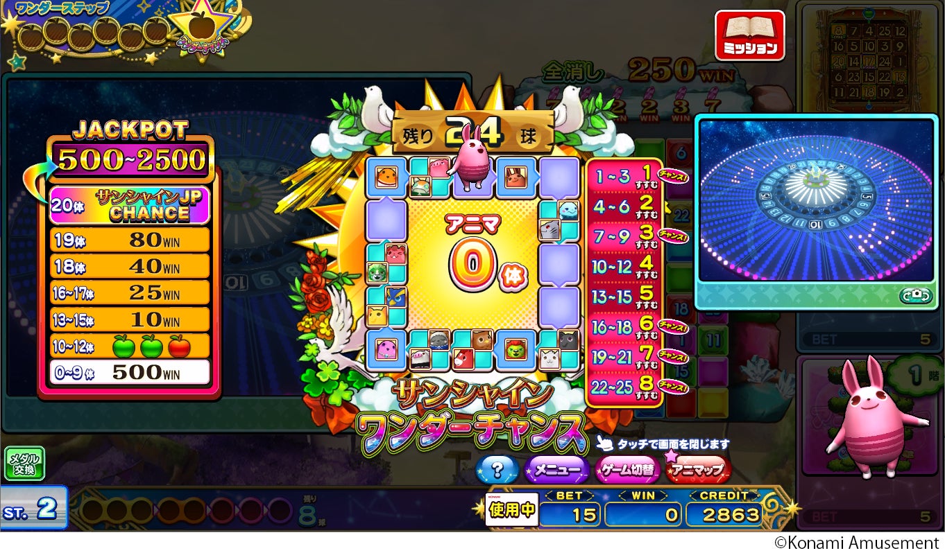 3ゲーム以内に各マスのアニマを合計20体集めると、「サンシャインJACKPOT CHANCE」が獲得できます。