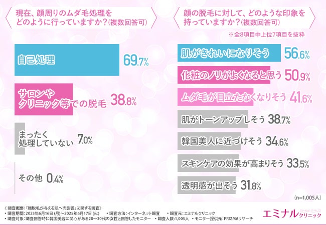 そこで今回、医療脱毛の「エミナルクリニック」は、韓国美容に関心がある20~30代の女性を対象に、「顔脱毛が与える肌への影響」に関する調査を実施しました。