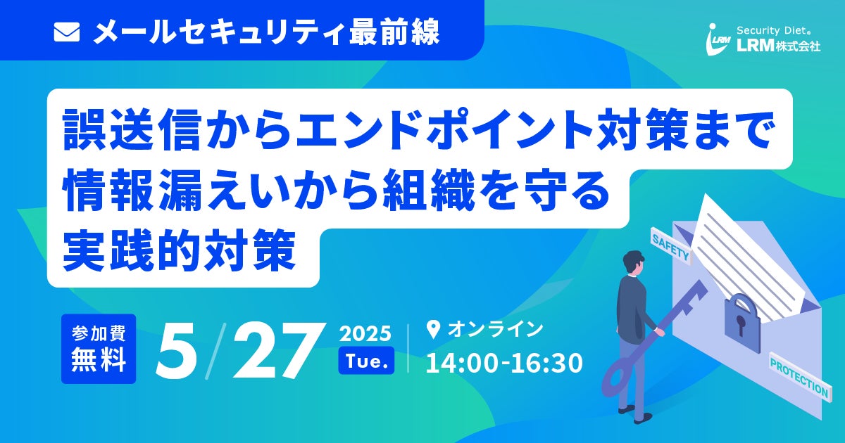 LRM株式会社(本社:兵庫県神戸市、代表取締役CEO:幸松哲也)、クロス・ヘッド株式会社(本社:東京都港区、代表取締役社長:徳升哲也)、グローバルセキュリティエキスパート株式会社(本社:東京都港区、代表取締役社長:青柳史郎)は、2025年5月27日(火)14時より、メールセキュリティにフォーカスしたセミナー「誤送信からエンドポイント対策まで情報漏えいから組織を守る実践的対策」を無料開催いたします。
