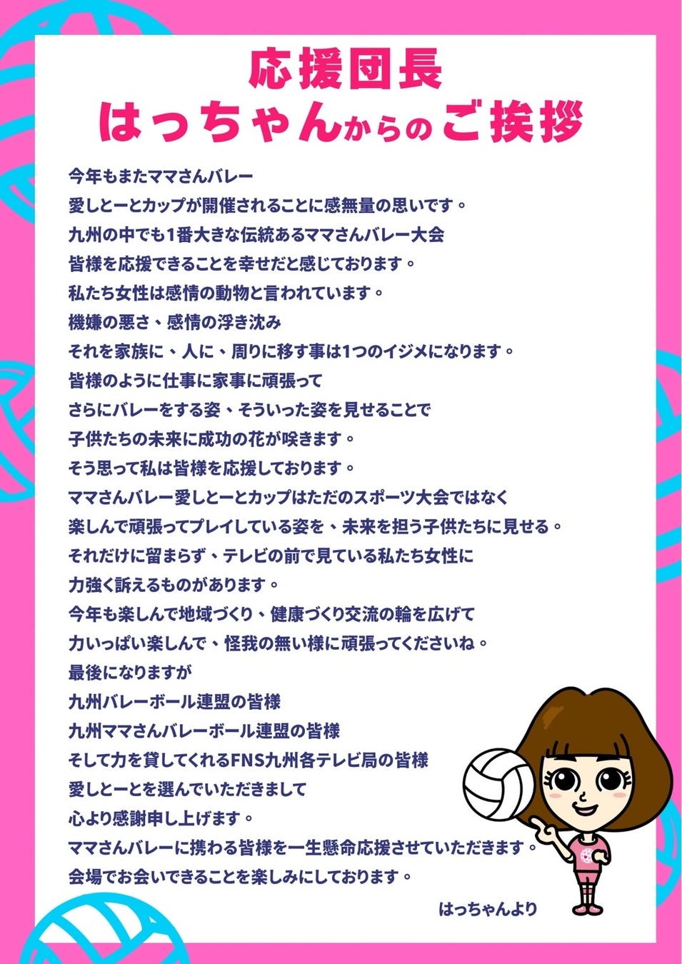 愛しとーとは、バレーボールに情熱を注ぎ、ひたむきにプレーするママさんたちの姿こそが、九州に活力を与える原動力だと信じています。愛しとーと代表のはっちゃんこと岩本初恵が応援団長となり、今年も九州各県のママさんバレーボーラーの皆さんを全力で応援し、大会の成功をサポートしてまいります。