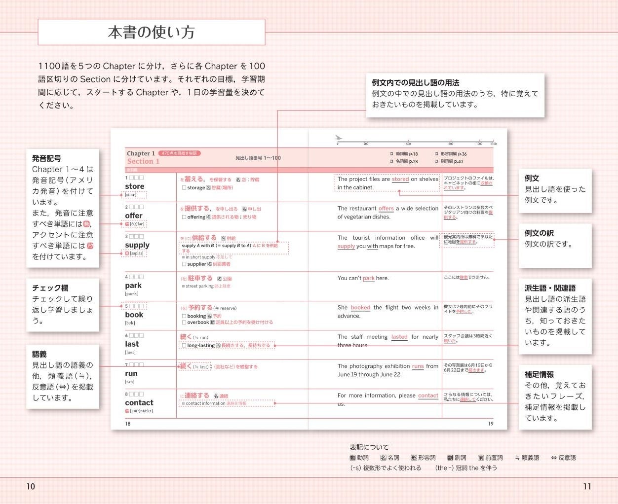 本書は、TOEIC L&Rテストに必要な1100の英単熟語を効率的に学べるよう、「一語一義」、「目標スコア別の構成」といったさまざまな工夫をしています。