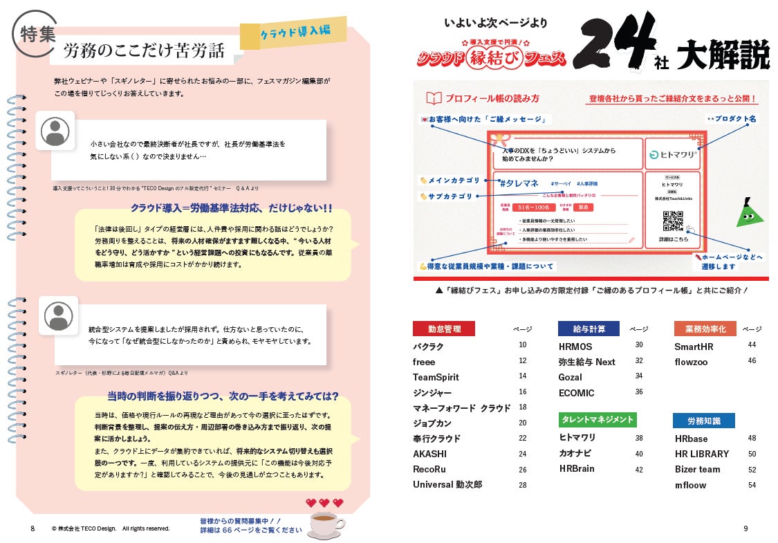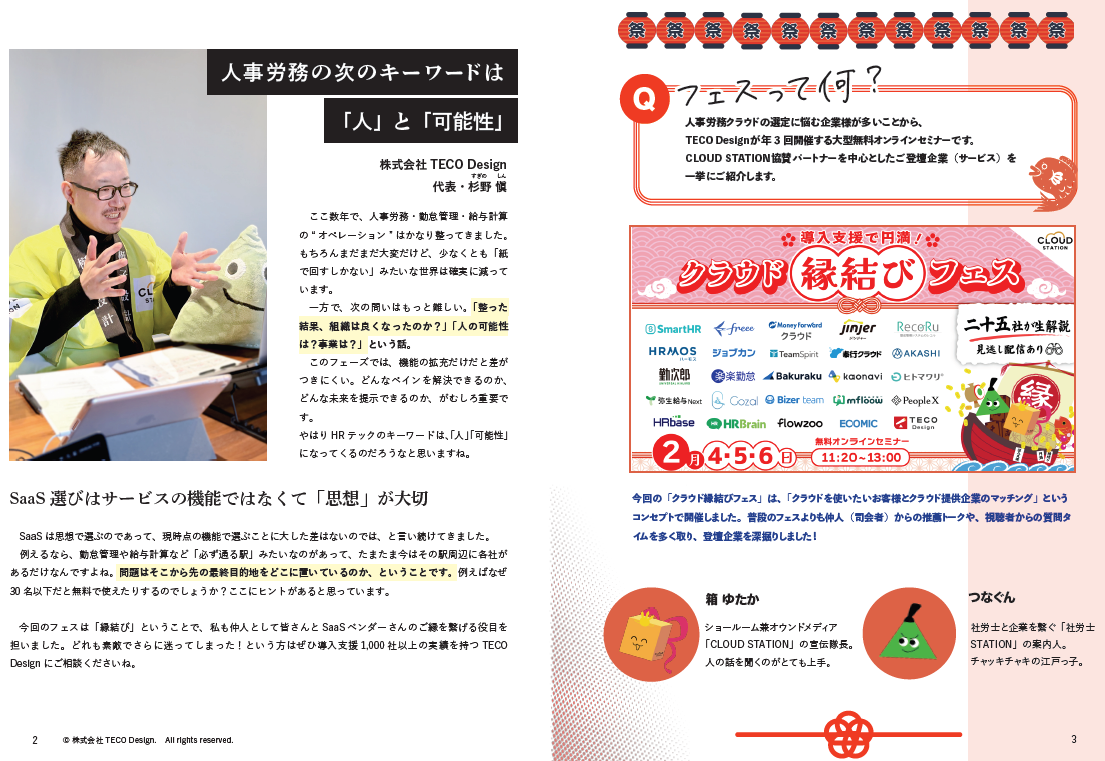 株式会社TECO Design(本社:東京都新宿区、代表取締役:杉野 愼)は、年3回開催している大型オンラインイベント「クラウド縁結びフェス」の公式冊子『フェスマガジン第2号』を公開いたしました。