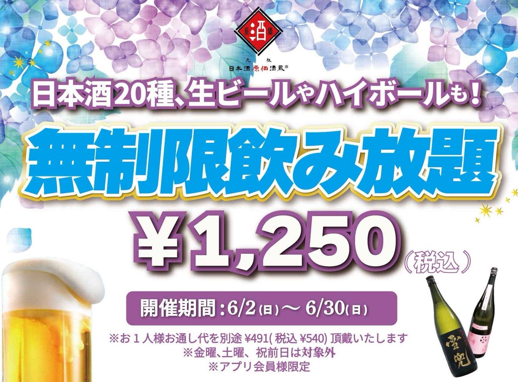 時間無制限(最大11時間)日本酒飲み放題¥1,250(税込)|日曜~木曜日、1日30名様限定┃6月2日~30日、日本酒原価酒蔵全店で開催