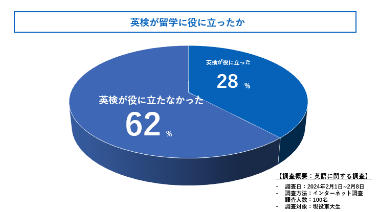 英検が留学で役に立たなかったの回答したのは、東大生全体の62%でした。役に立たなかったと回答しいたのは、留学先の決において英検のスコアが必要なかったということを言っているのであって、英検の勉強を通して身に着けた知識が役に立たなかったという人は居ませんでした。このことから、英検は取っていて損はないと言えるでしょう。