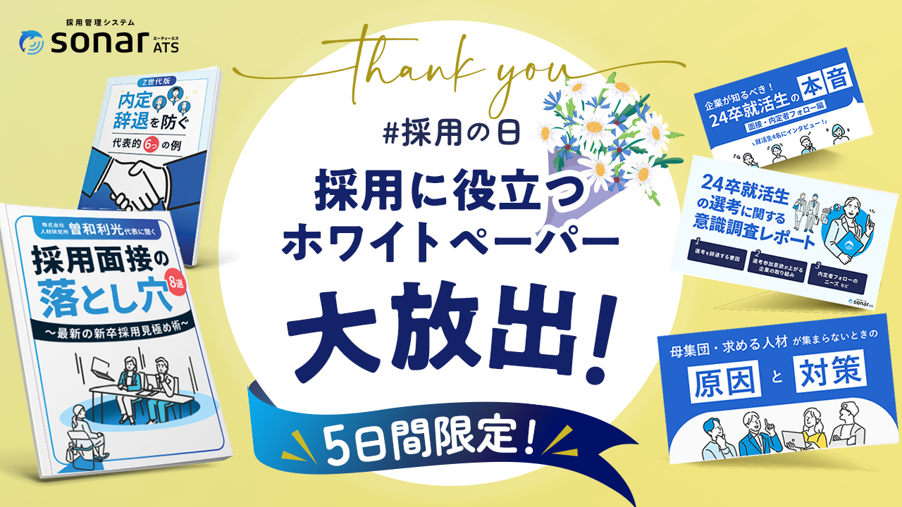 24卒就活生の本音や、Z世代の内定辞退を防ぐ方法など、採用活動に役立つホワイトペーパー5本を大放出します。1,800社以上の採用活動を支援してきたThinkingsが独自にまとめた、今すぐ役立つ情報が” フォーム入力不要・ワンクリック”で全ページご覧いただける初めての企画です。「採用の日」にあわせて3月11日~15日の5日間限定で公開します。ぜひご活用ください。