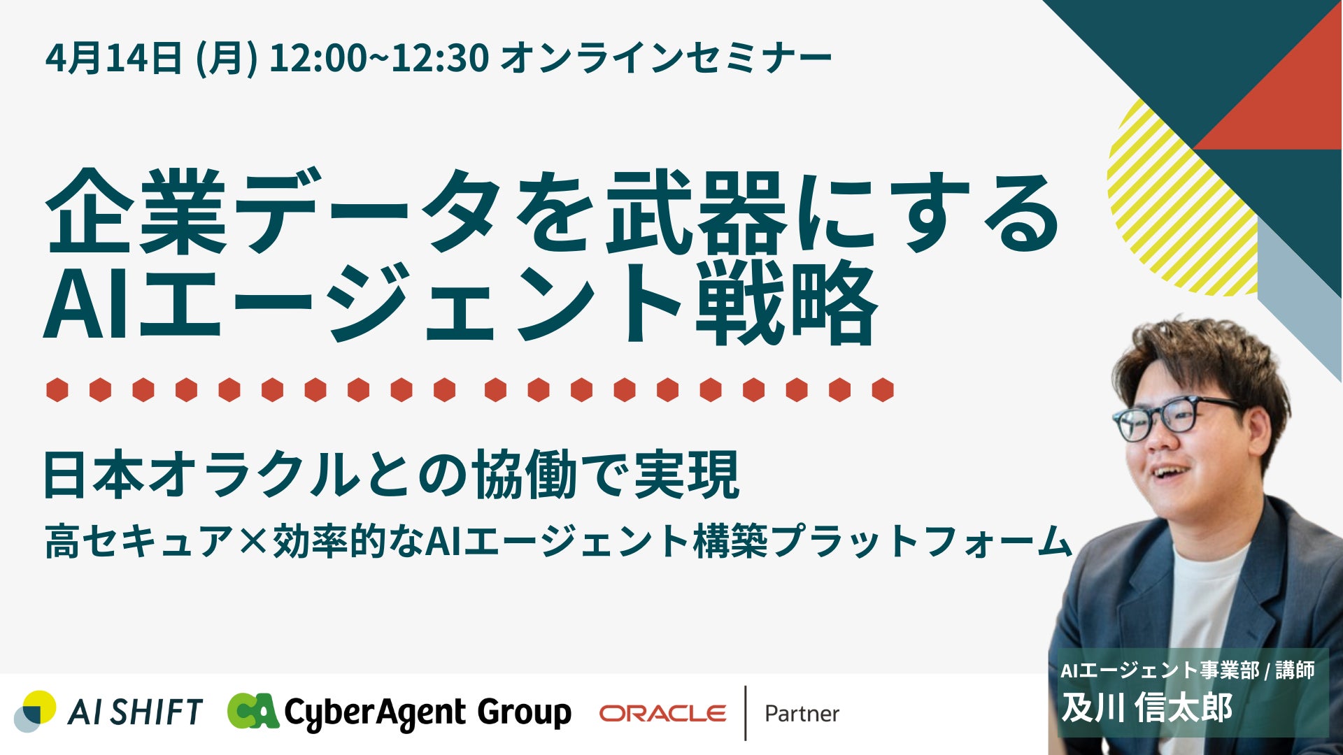 株式会社サイバーエージェント(本社:東京都渋谷区、代表取締役:藤田晋、東証プライム市場:証券コード4751)の100%子会社で、AIエージェントを提供する株式会社AI Shift(本社:東京都渋谷区、代表取締役社長:米山結人)は、企業データを有効活用するAIエージェントに関するオンラインセミナーを開催いたします。