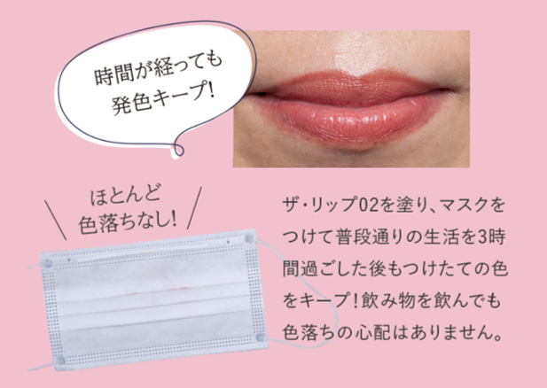 色は大人の肌を明るく見せるブラウンレッドを採用。『THE LIP 01』と同様、水分を活用してジェル状の膜に変化し唇に密着することで、マスク着用による色落ちや、飲み物を飲む際のカップへの色移りを防ぎ、長時間つけたての色を持続します。