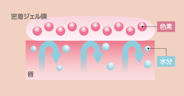 リップクリームに配合された特殊な成分が、唇から蒸発する水分を活用してジェル状の膜に変化し、唇にピタッと密着します。