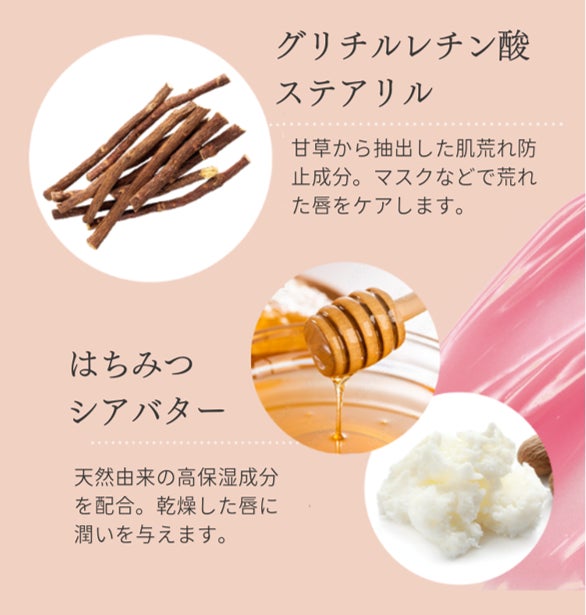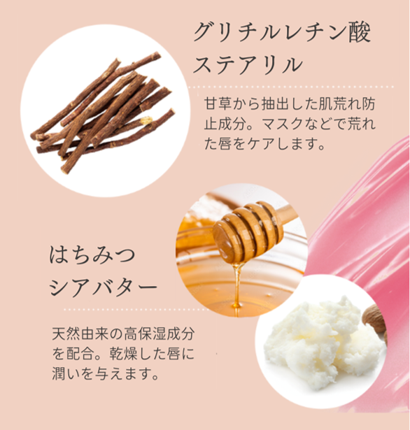 有用成分のグリチルレチン酸ステアリルを配合し、マスク着用により荒れやすくなる唇をやさしくケア。