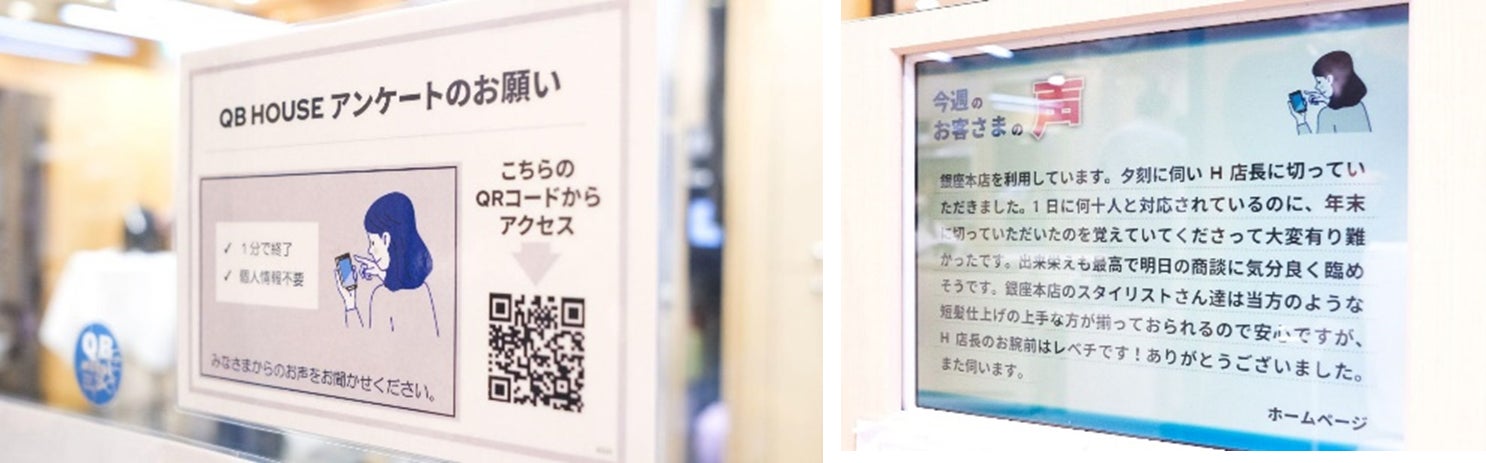 店舗内の待合スペースにアンケートのPOPとQRコードを掲示しお客様の声を収集。長文で熱意のこもったメッセージなど、毎月約1,500件を超える声が集まっています。集まった声は店舗のモニターで紹介し他のお客様にシェアしたり、社内のYouTubeチャンネルで紹介したりして従業員モチベーションアップにもつなげています。