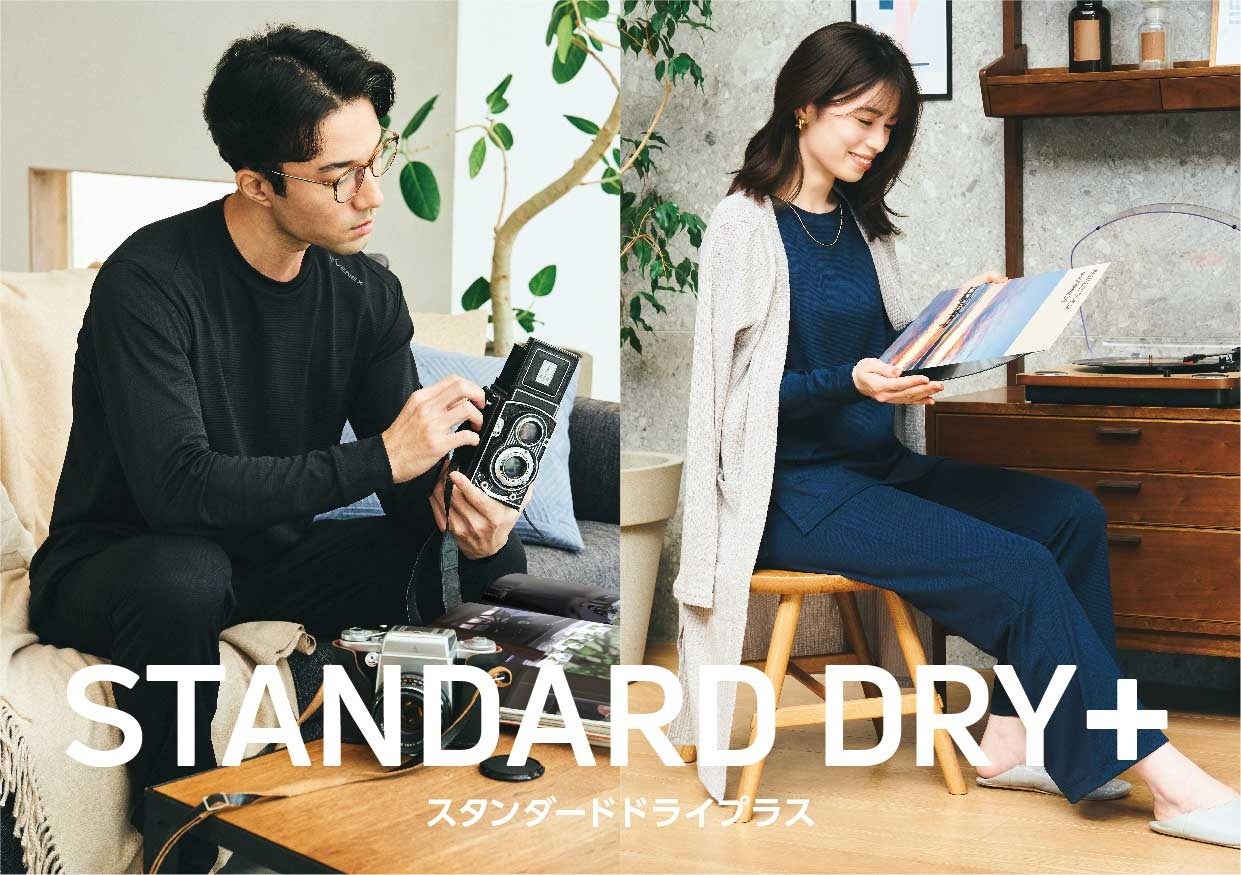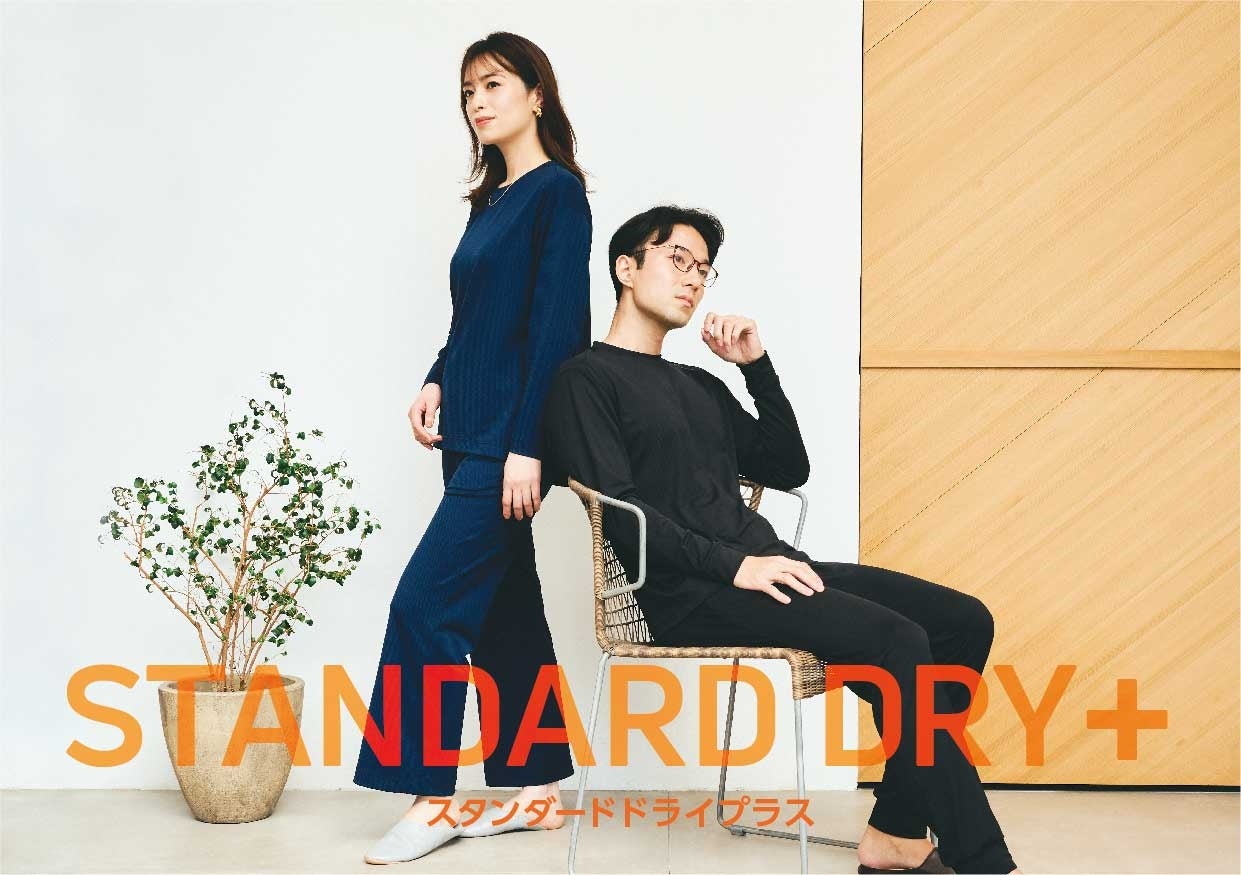 今回発売する『STANDARD DRY+(スタンダードドライプラス)』は、当社の人気定番シリーズ『STANDARD DRY』と同じ吸水速乾性に優れた伸縮性の高い生地を使用し、その素材感や着ごこちの良さはそのままに、トレンドを取り入れたデザイン性を+(プラス)した新商品です。一般医療機器「家庭用遠赤外線血行促進用衣」の届出を完了しており、ルームウェアやパジャマとして「着て休む、ただそれだけ」で、日々の疲労を回復させ、肩・腰・筋肉などのコリの改善にも効果が期待できます。