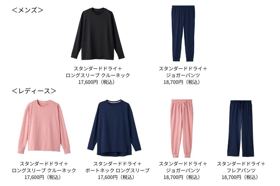 シンプルでありながら、新しいデザインの『STANDARD DRY+』は、着ごこちはもちろんシルエットにもこだわり、着痩せ効果や脚長効果を狙ったディテールにしています。よりリラックスしやすいよう、トップスはほど良いドロップショルダーで、裾にスリットを入れたデザインに。レディースはジョガーパンツ、フレアパンツなどバリエーション豊かなラインナップ。メンズ2型、レディース4型の全6型です。カラーは、メンズのネイビー、ブラック、レディースのサクラ、ネイビーのそれぞれ2色展開。ご自身のライフスタイルに合わせてお好みのデザインを選んで、リラックスのひとときをより上質なものにしませんか。